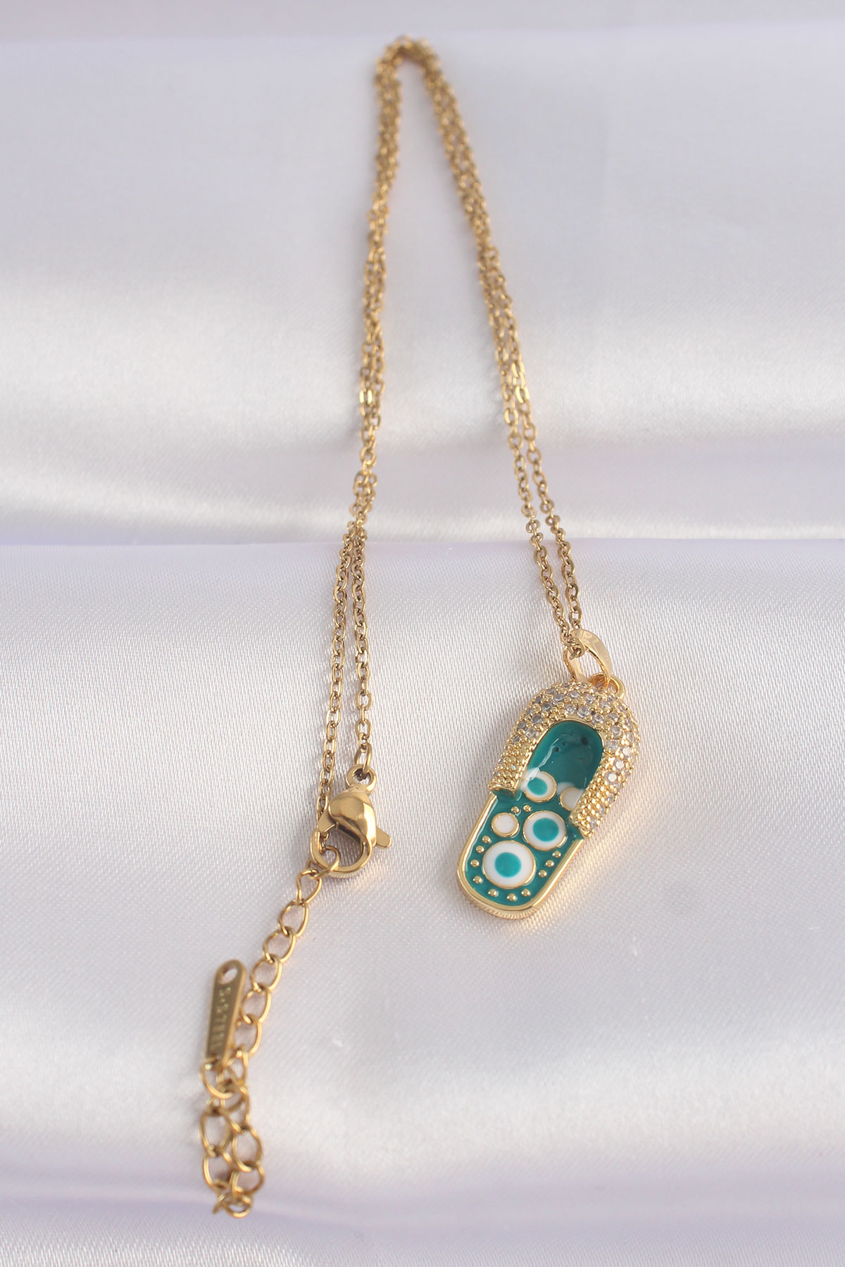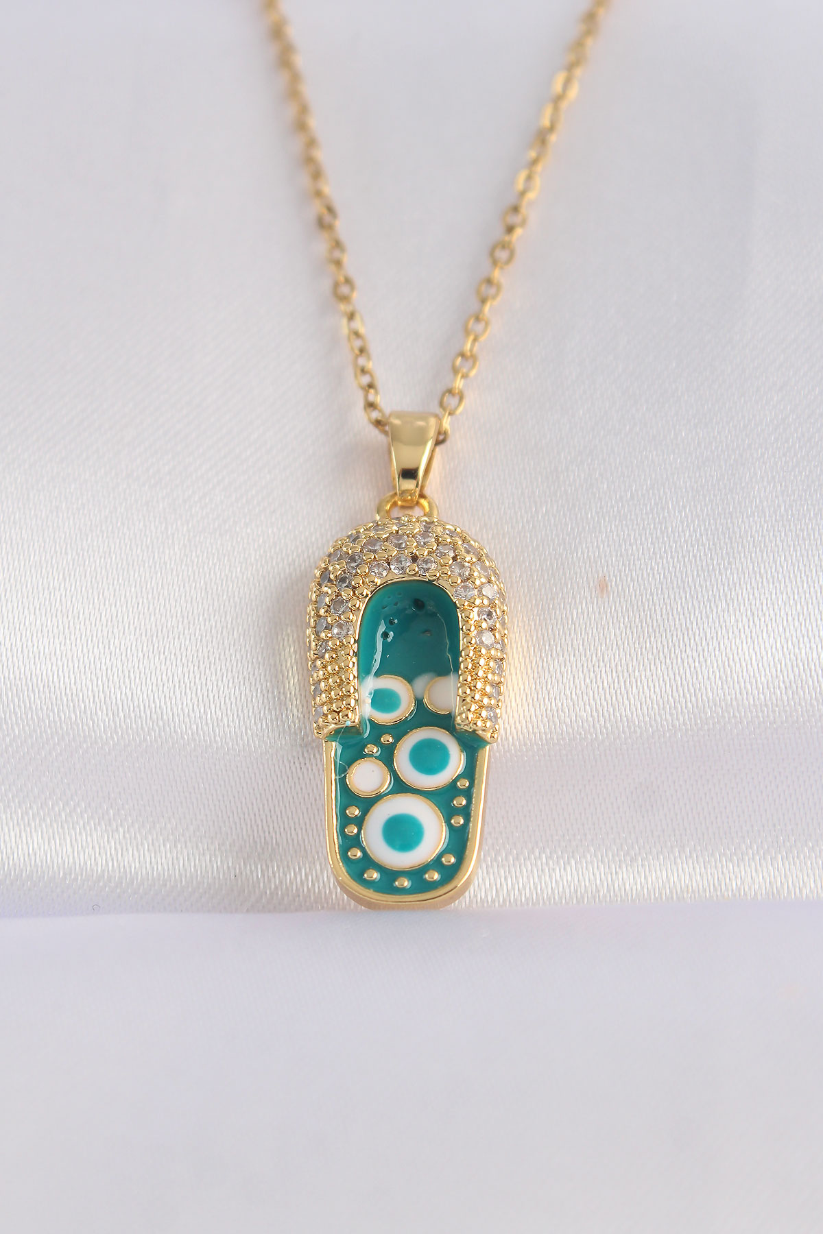 316L Çelik Zincir Zirkon Taşlı Altın Renk Nazarlı Terlik Tasarımlı Kolye