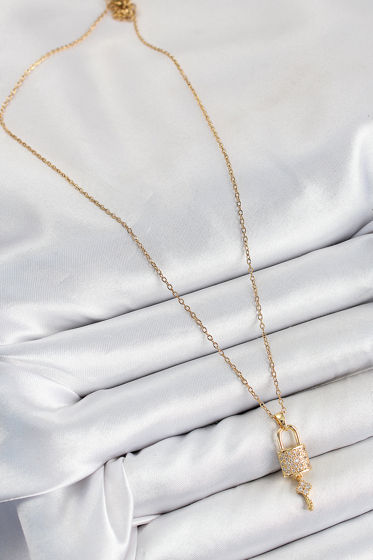 316L Çelik Zirkon Taşlı Kilit Ve Sallantılı Anahtar Model Gold Renk Kadın Kolye