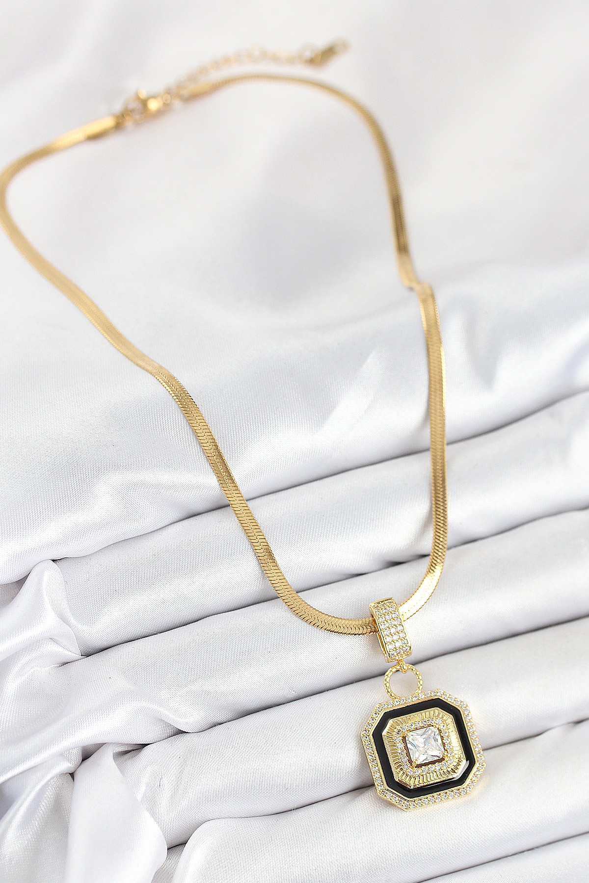 316L Çelik Zirkon Taşlı Siyah Detaylı Baget Model Gold Renk Kadın Kolye