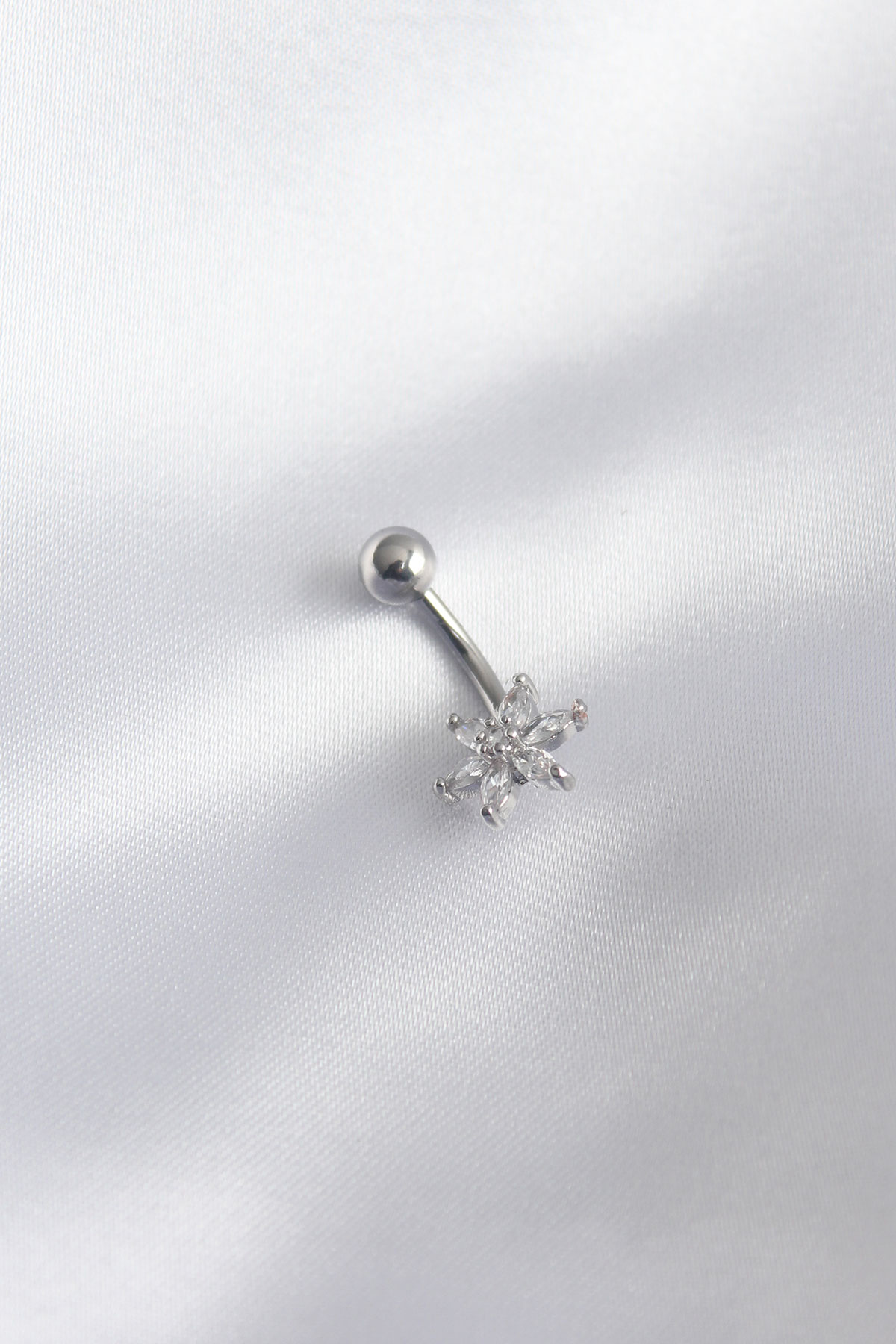 316L Cerrahi Çelik Gümüş Renk Zirkon Taşlı Çiçek Model Kadın Göbek Piercing