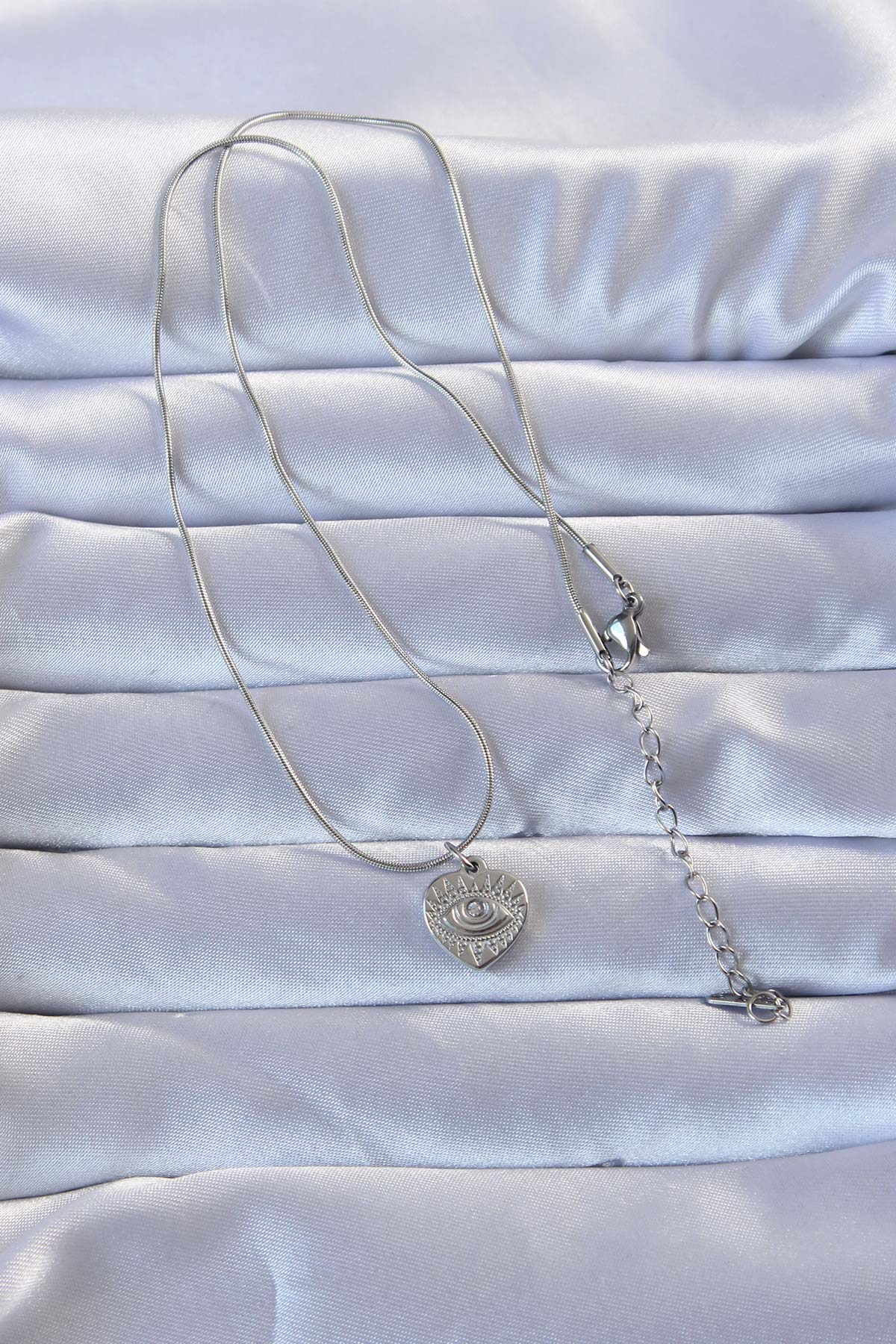 316L Gümüş Renk Zirkon Taşlı İşlemeli Göz Detay Kalp Kolye