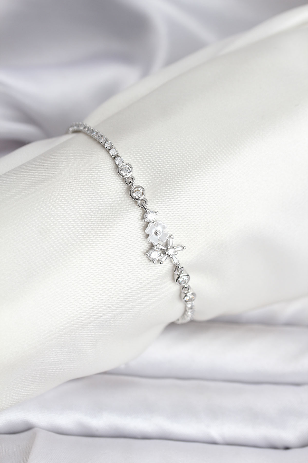 Çiçekli Model Zirkon Taşlı Gümüş Renk Su Yolu Kadın Bileklik