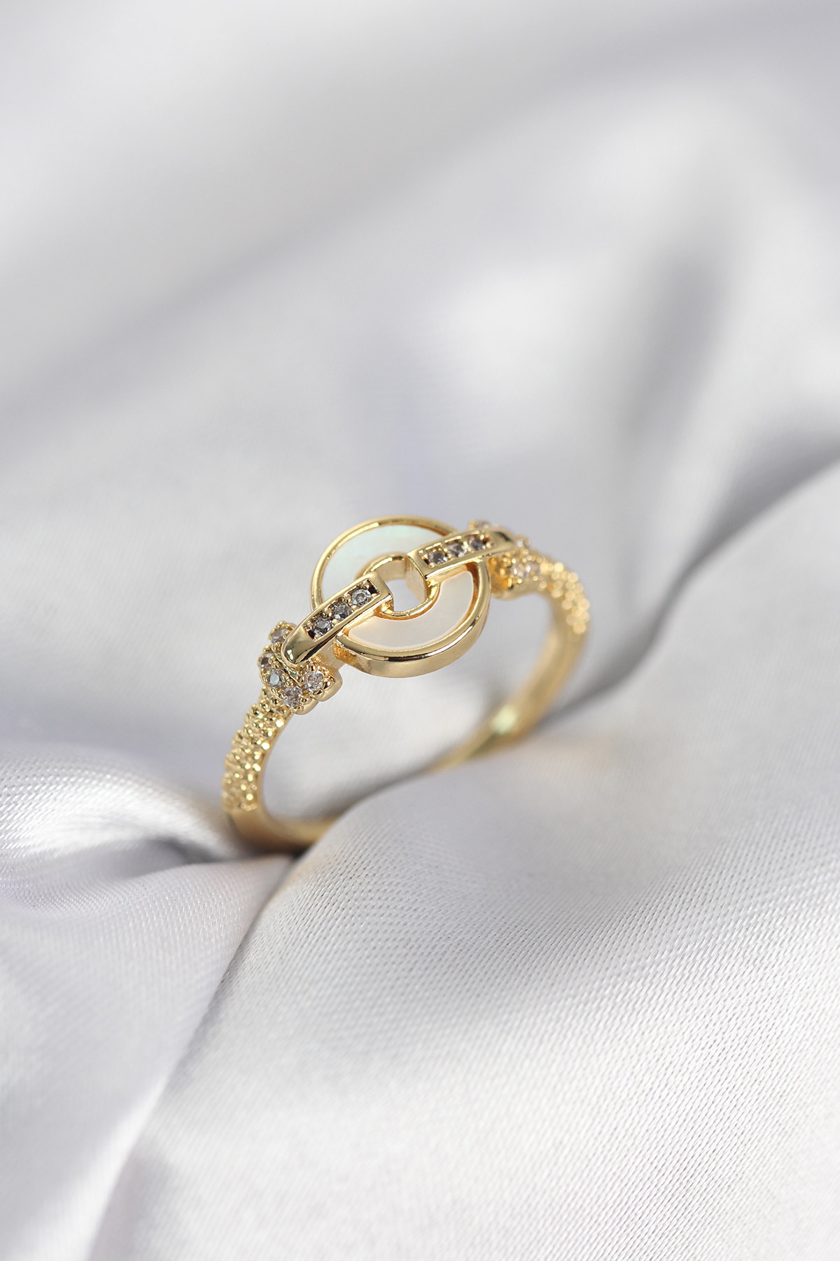 Gold Renk Daire Form Sedef ve Zirkon Taşlı Kadın Yüzük
