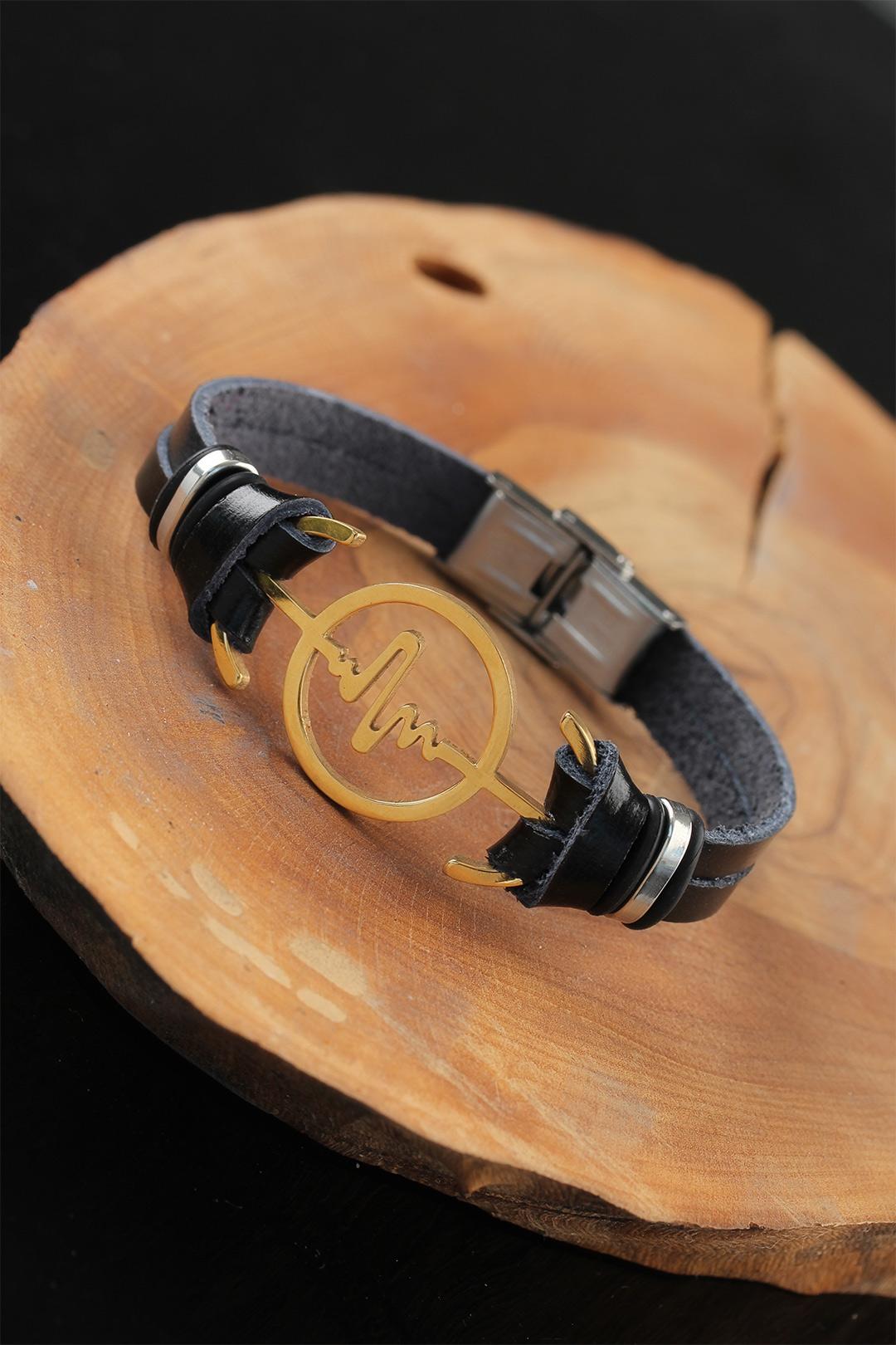 Gold Renk Metal Nabız Tasarım Siyah Renk Deri Erkek Bileklik