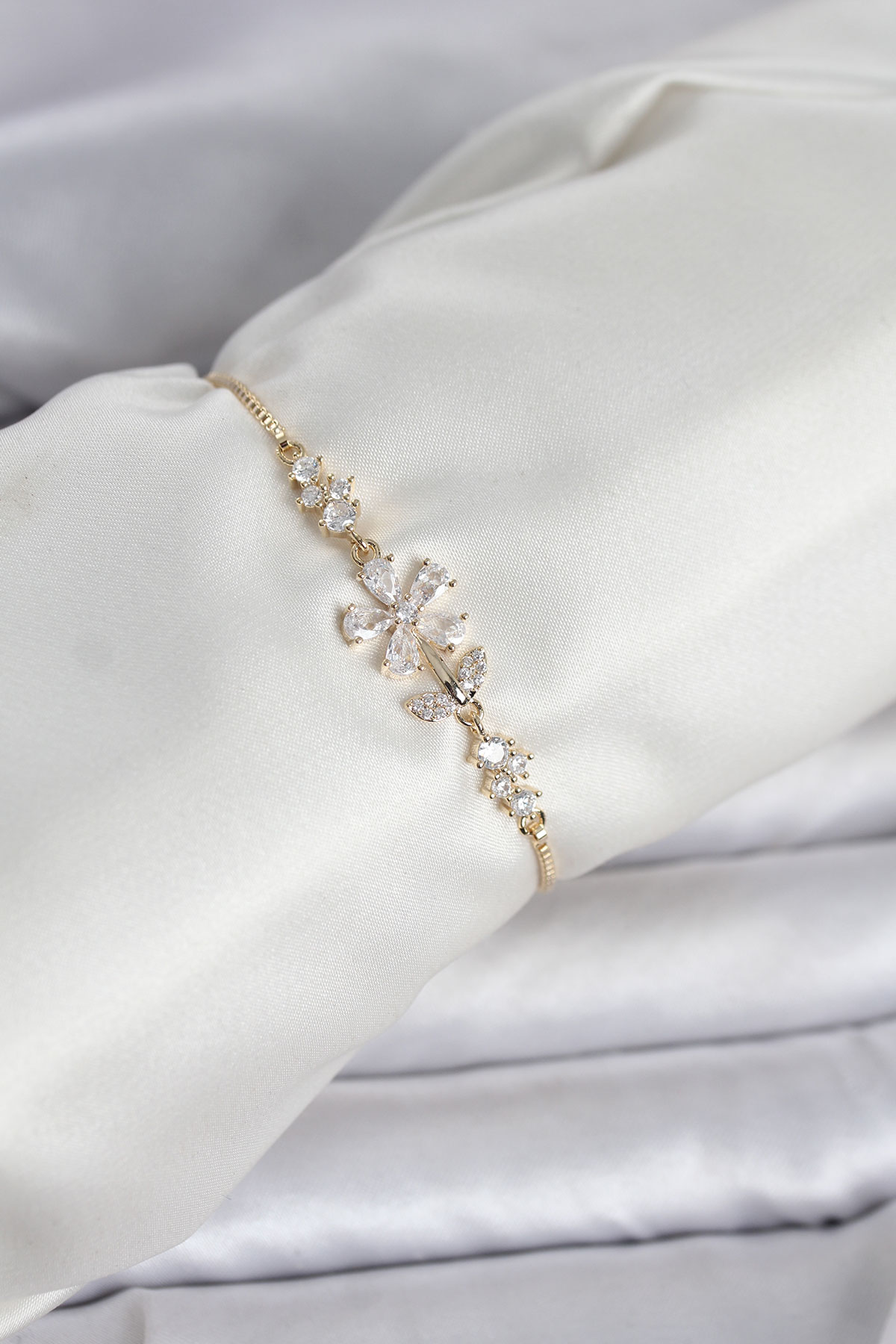 Gold Renk Zirkon Taşlı Papatya Model Asansörlü Kadın Bileklik
