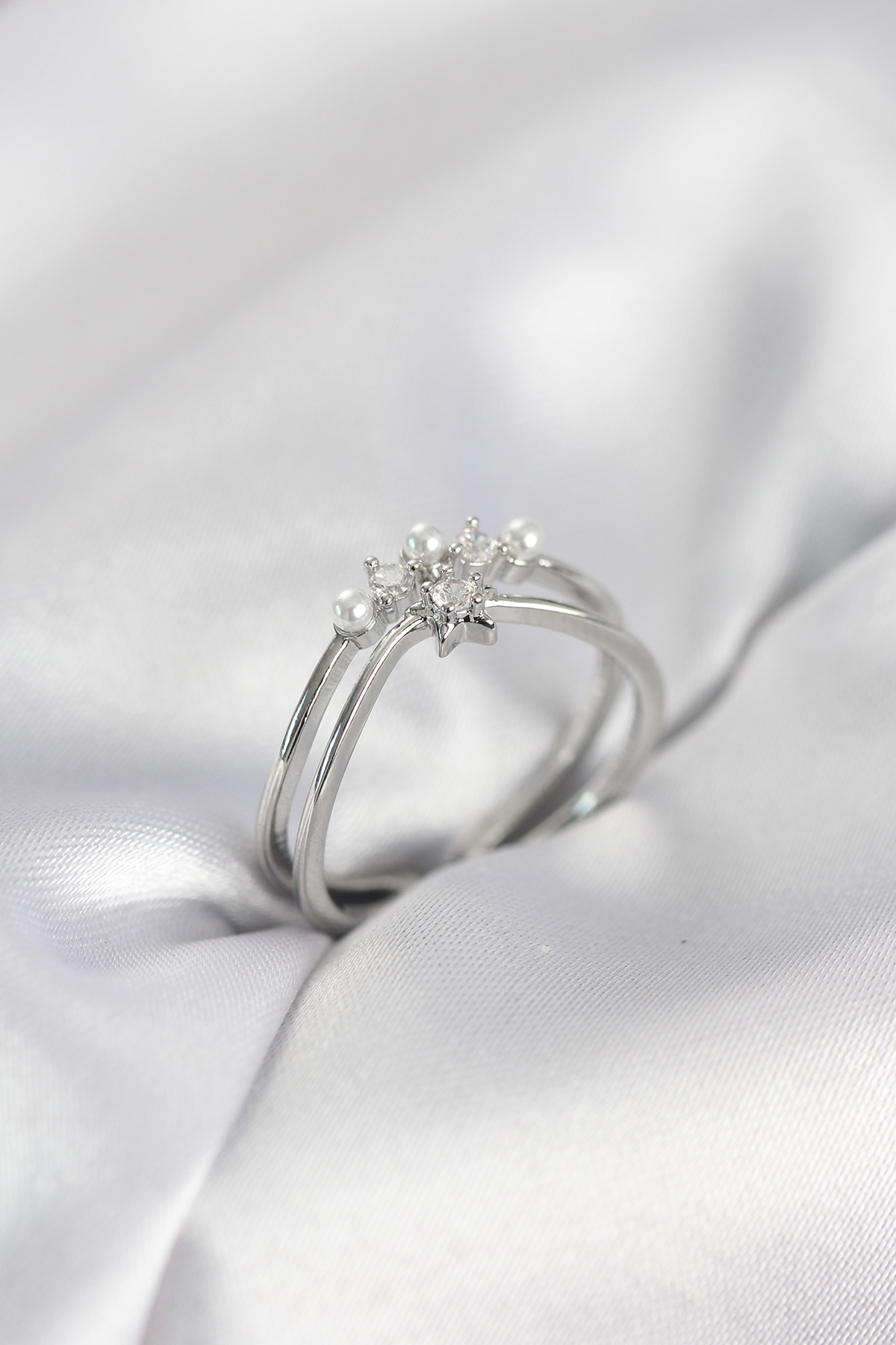 Gümüş Renk İncili Yıldız Model Zirkon Taşlı Kadın Yüzük
