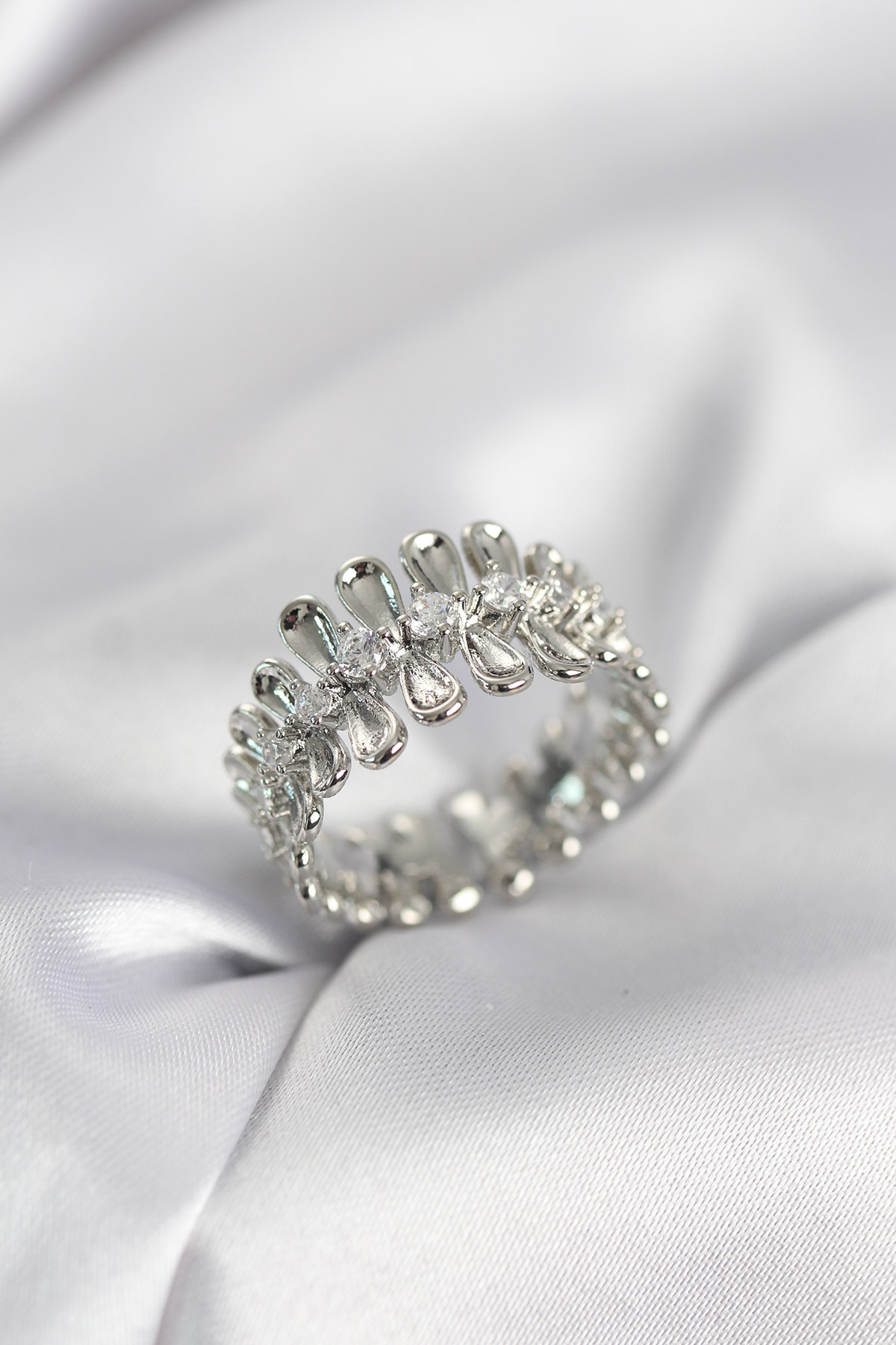 Gümüş Renk Zirkon Taşlı Sıralı Damla Model Kadın Yüzük