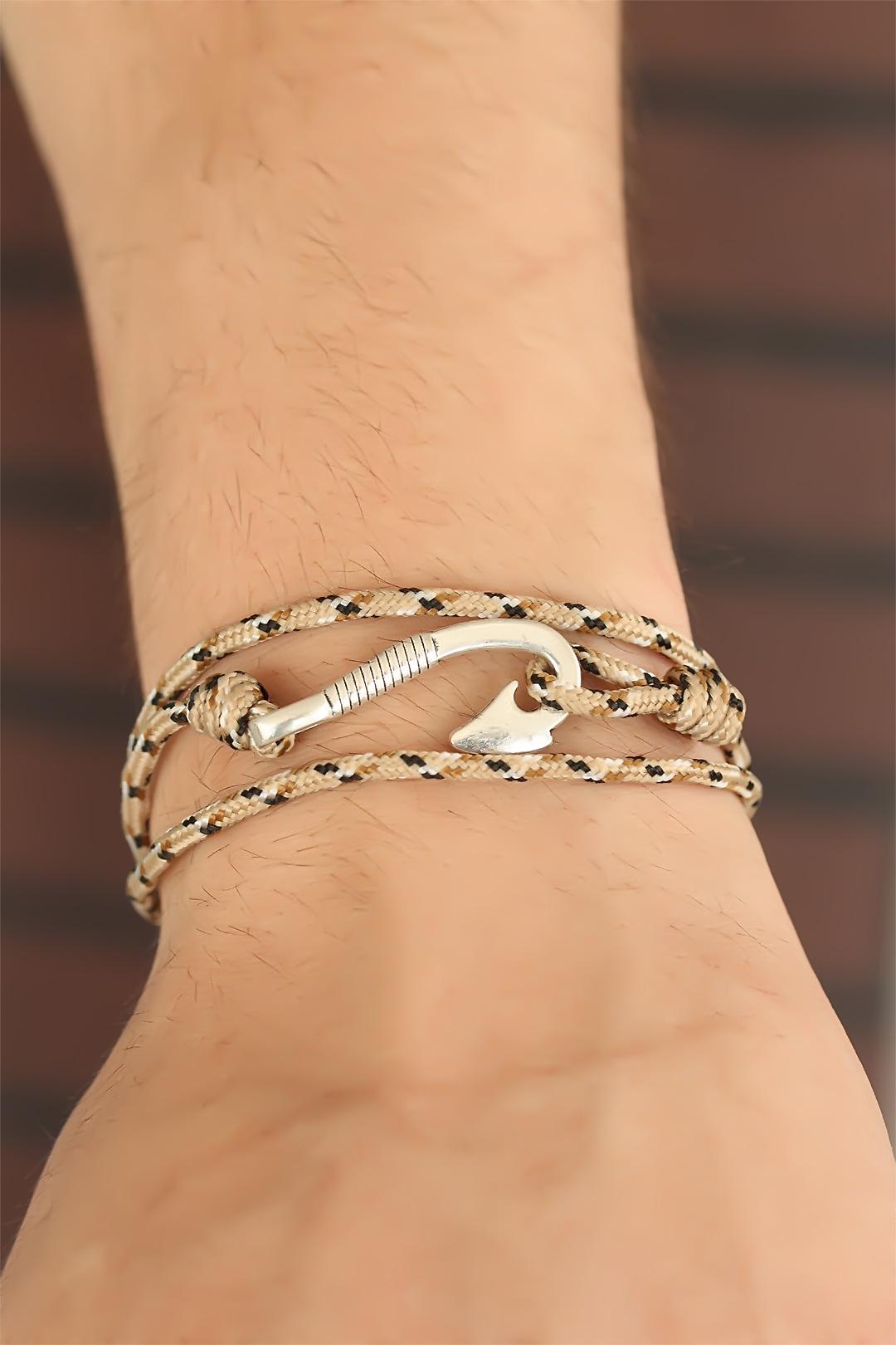 Krem Renk Çizgi Desenli Metal Kancalı Erkek Bileklik
