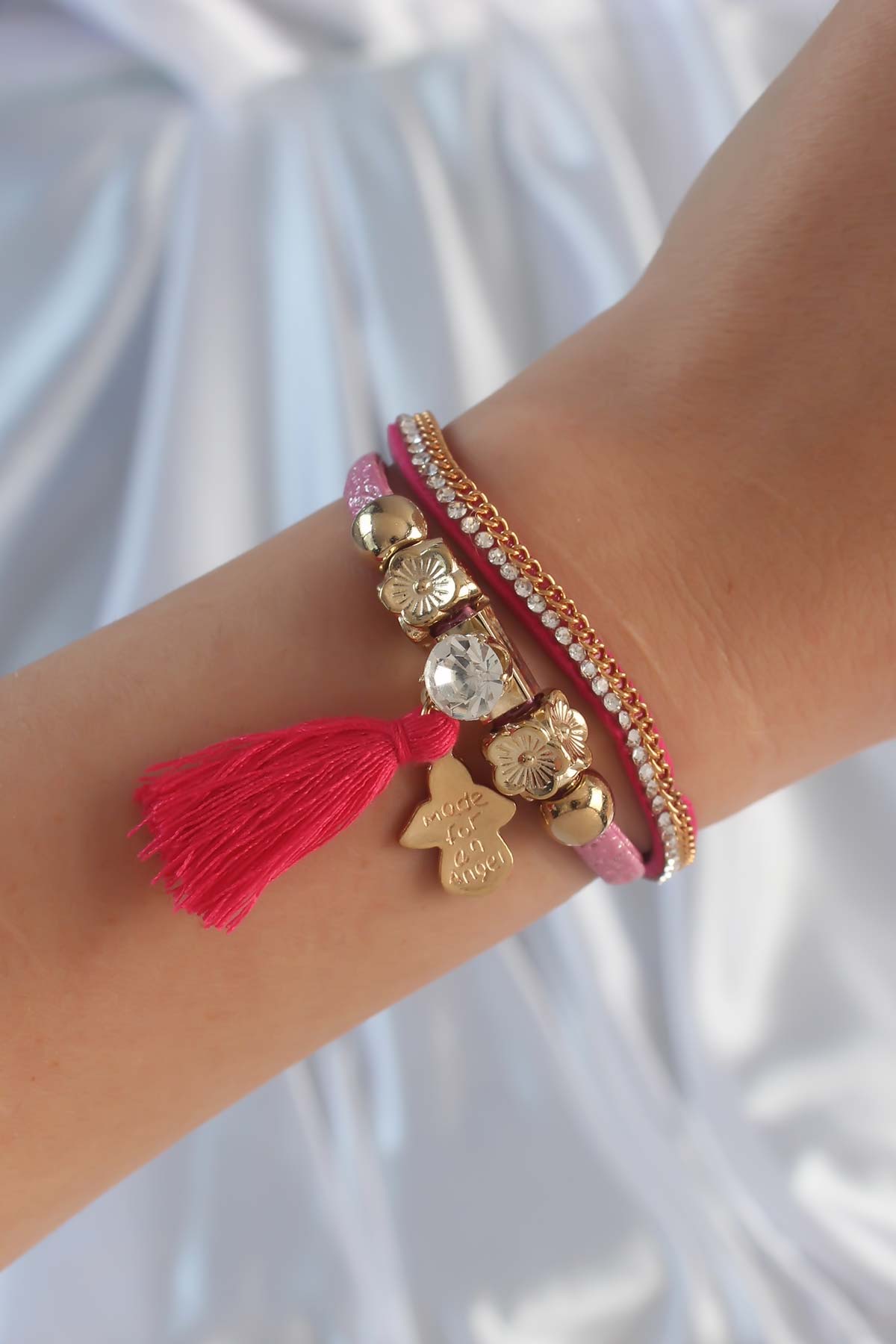 Pembe Renk Zirkon Taşlı Püskül Detay Deri Çoklu Bileklik