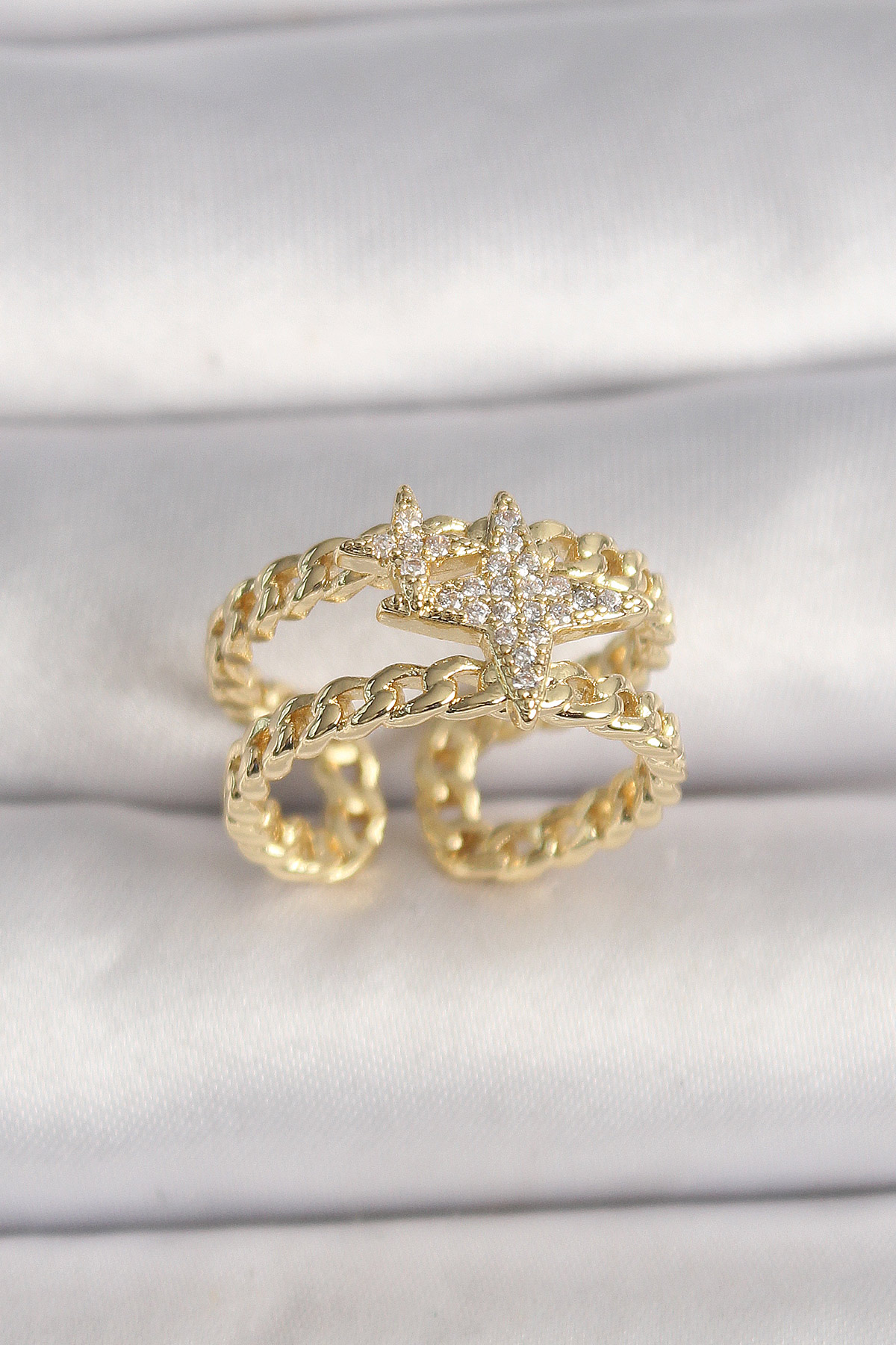 Pirinç Gold Renk 2’Li Zincir Zirkon Taşlı Yıldız Figür Kadın Yüzük