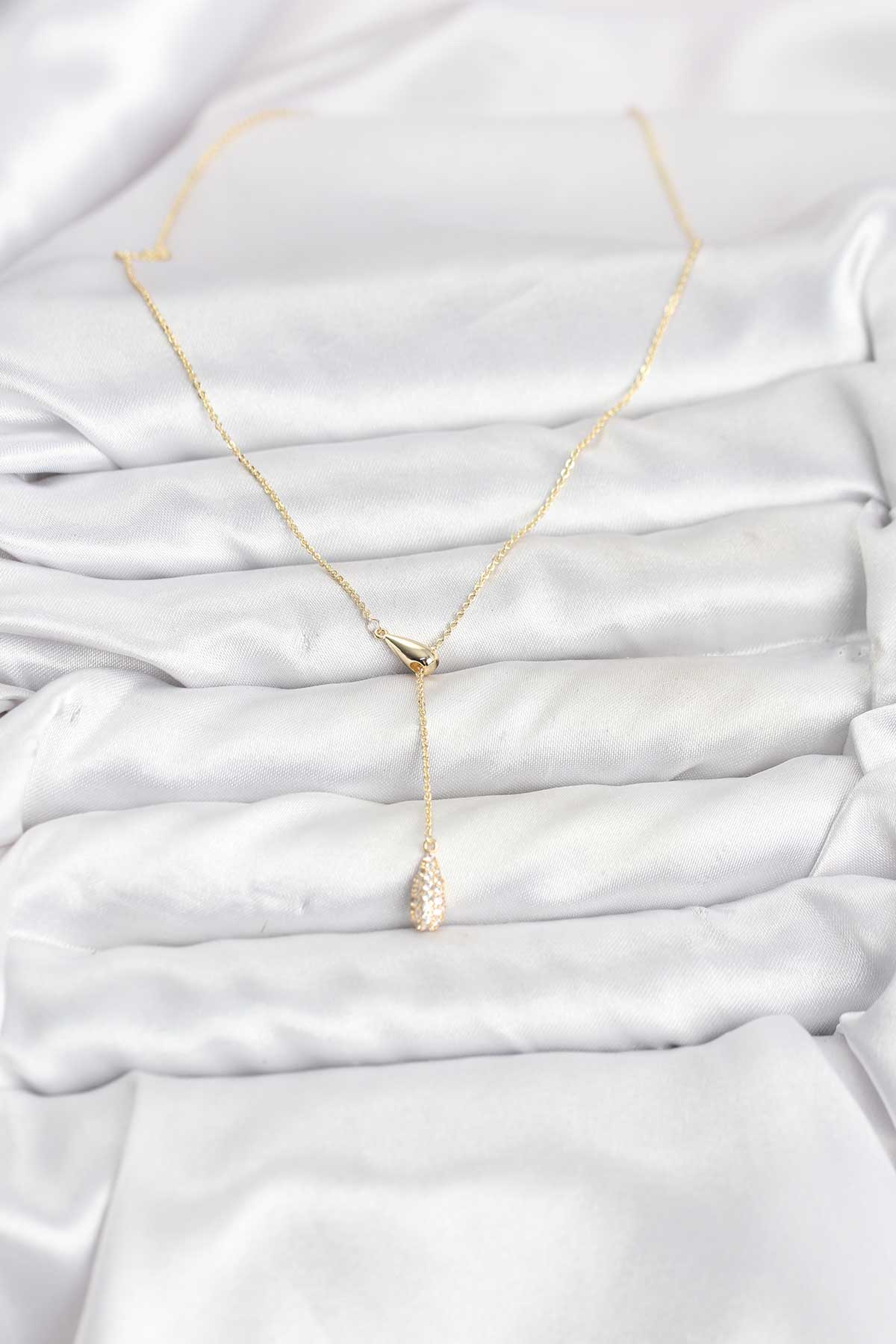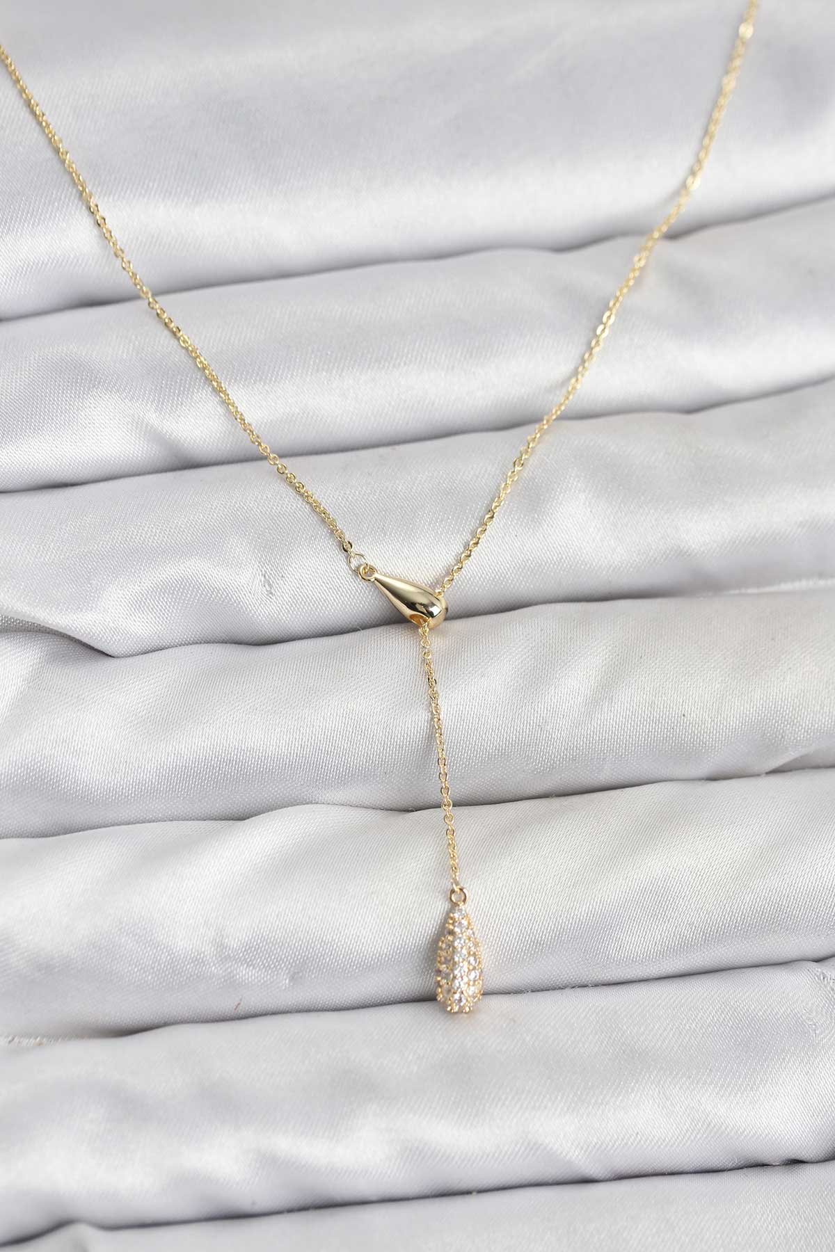 Pirinç Gold Renk Asansörlü Damla Model Kadın Kolye