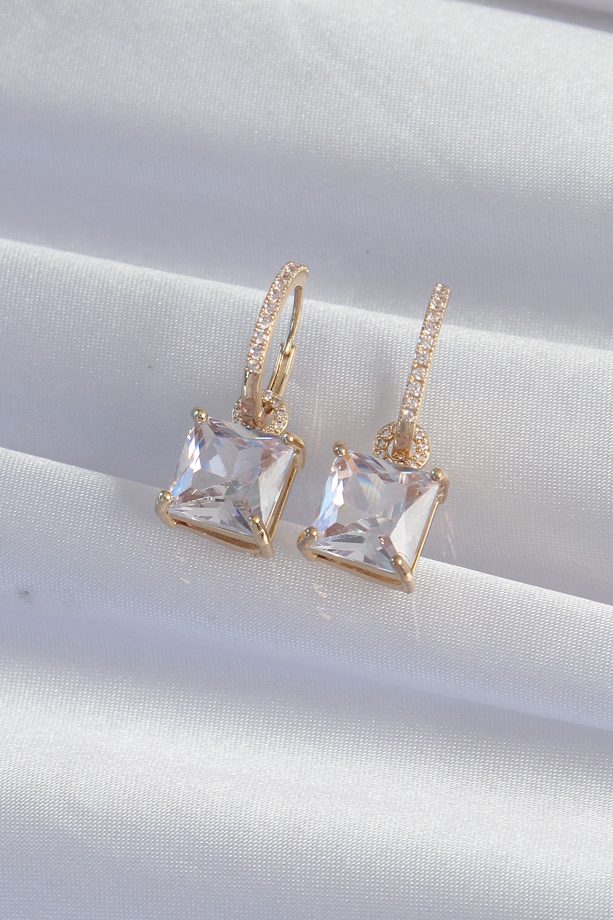 Pirinç Gold Renk Kare Zirkon Taşlı Halka Küpe