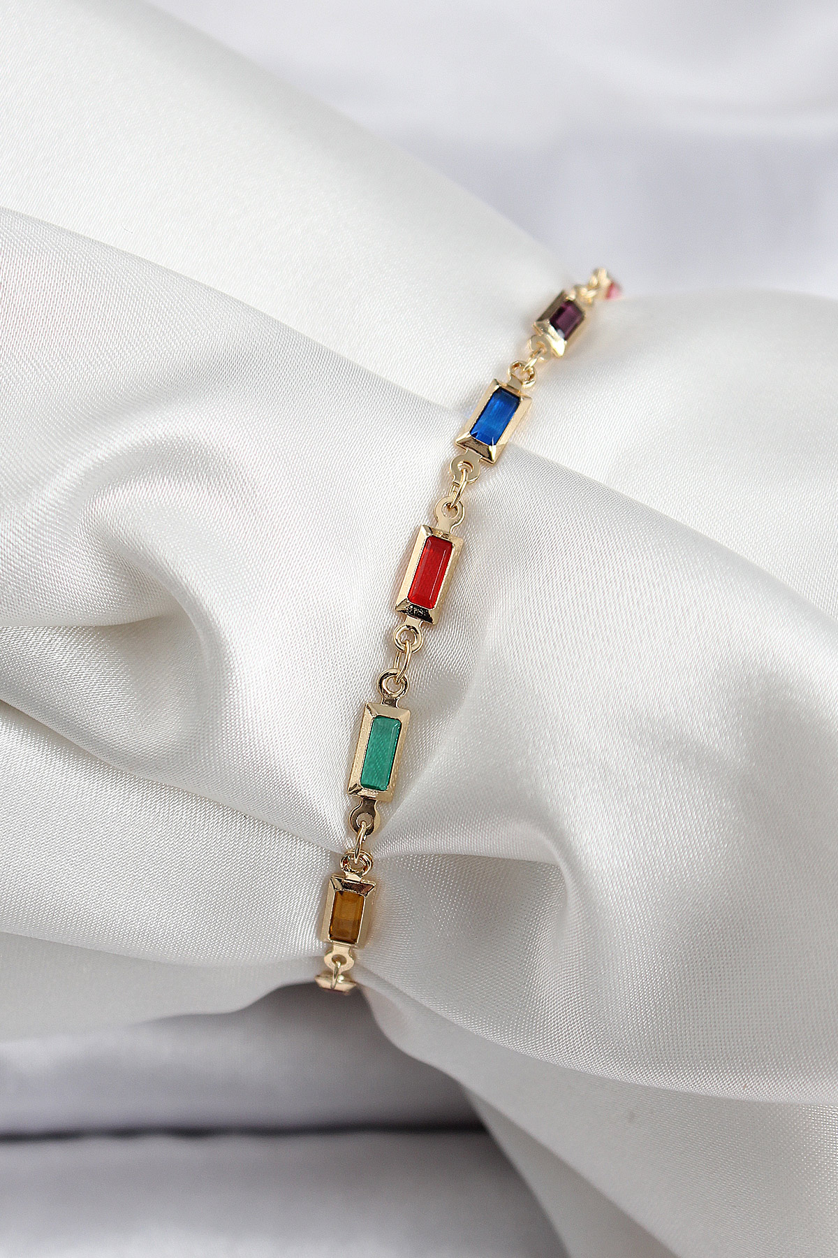 Pirinç Gold Renk Karışık Renkli Kare Zirkon Taşlı Kadın Bileklik