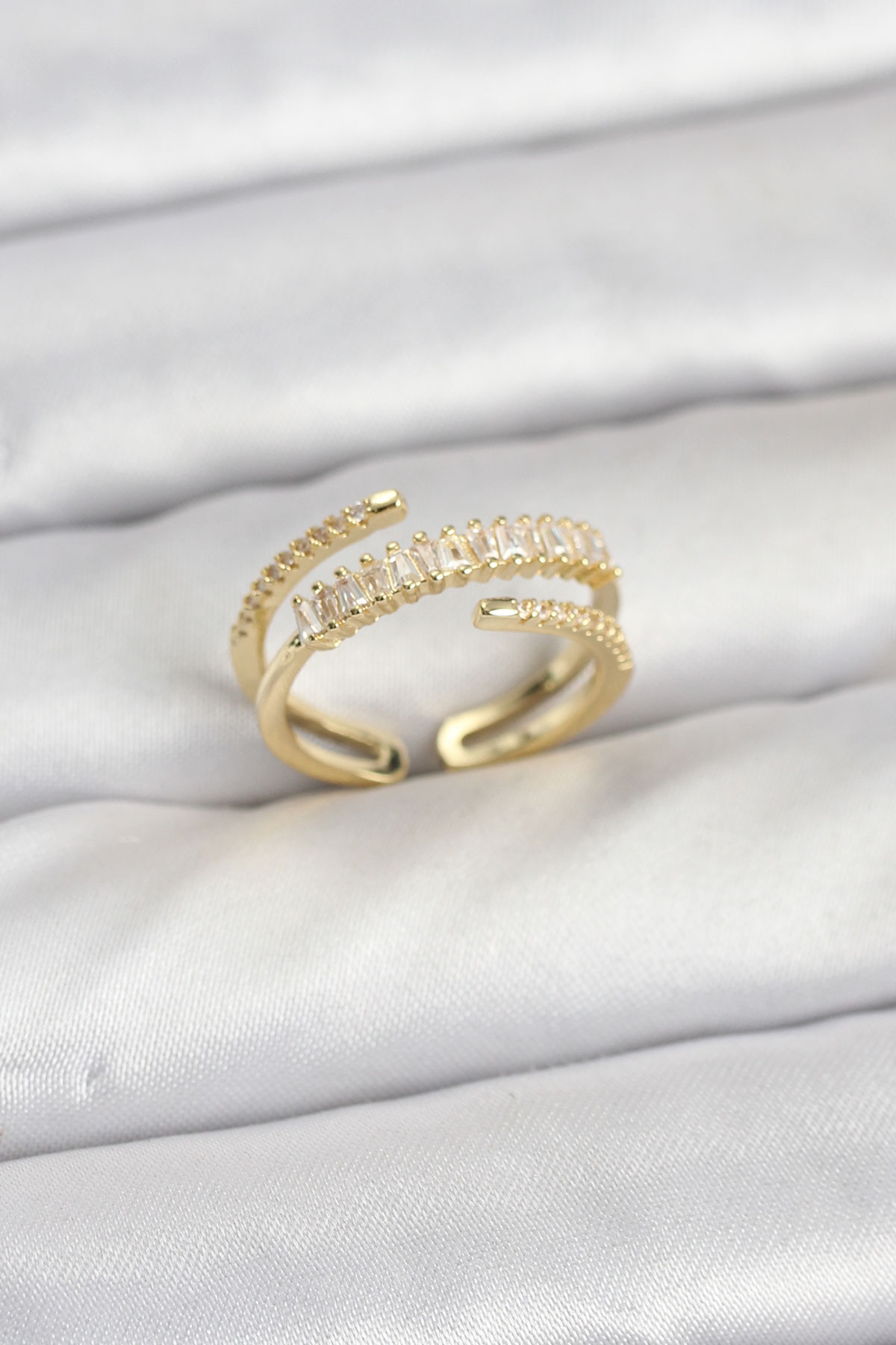 Pirinç Gold Renk Sıralı Baget Zirkon Taşlı Kadın Yüzük
