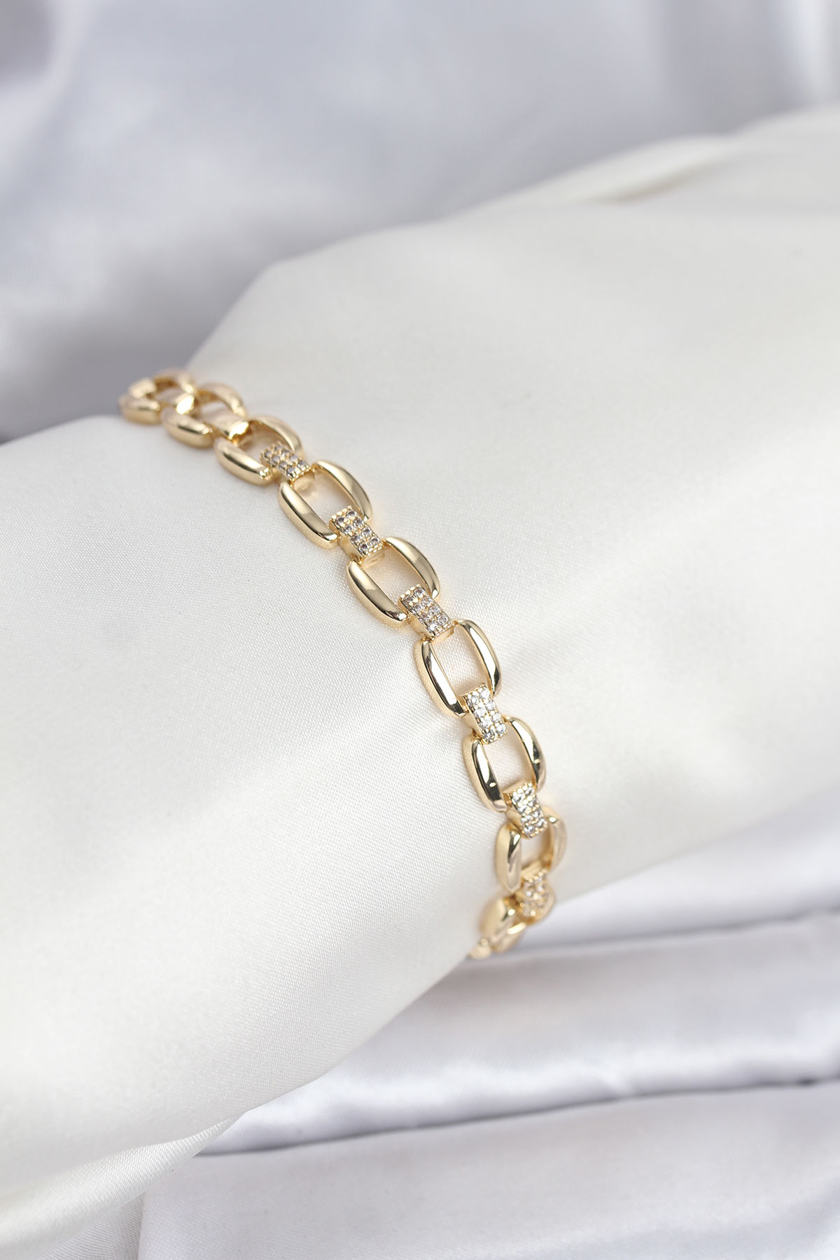 Pirinç Gold Renk VIP Seri Zincir Model Zirkon Taşlı Kadın Bileklik