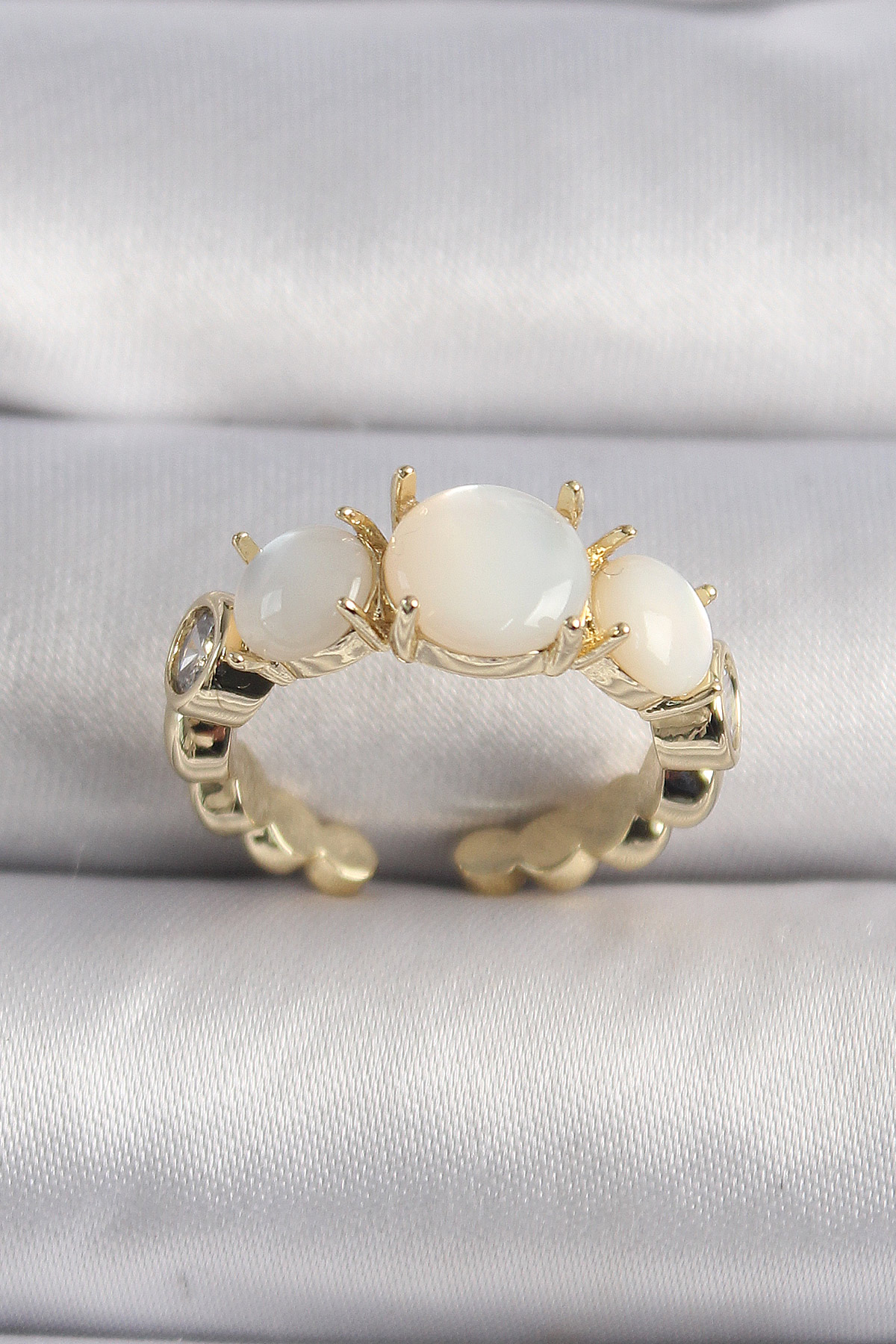 Pirinç Gold Renk Zirkon Taş Detaylı Beyaz Sedefli VIP Seri Kadın Yüzük