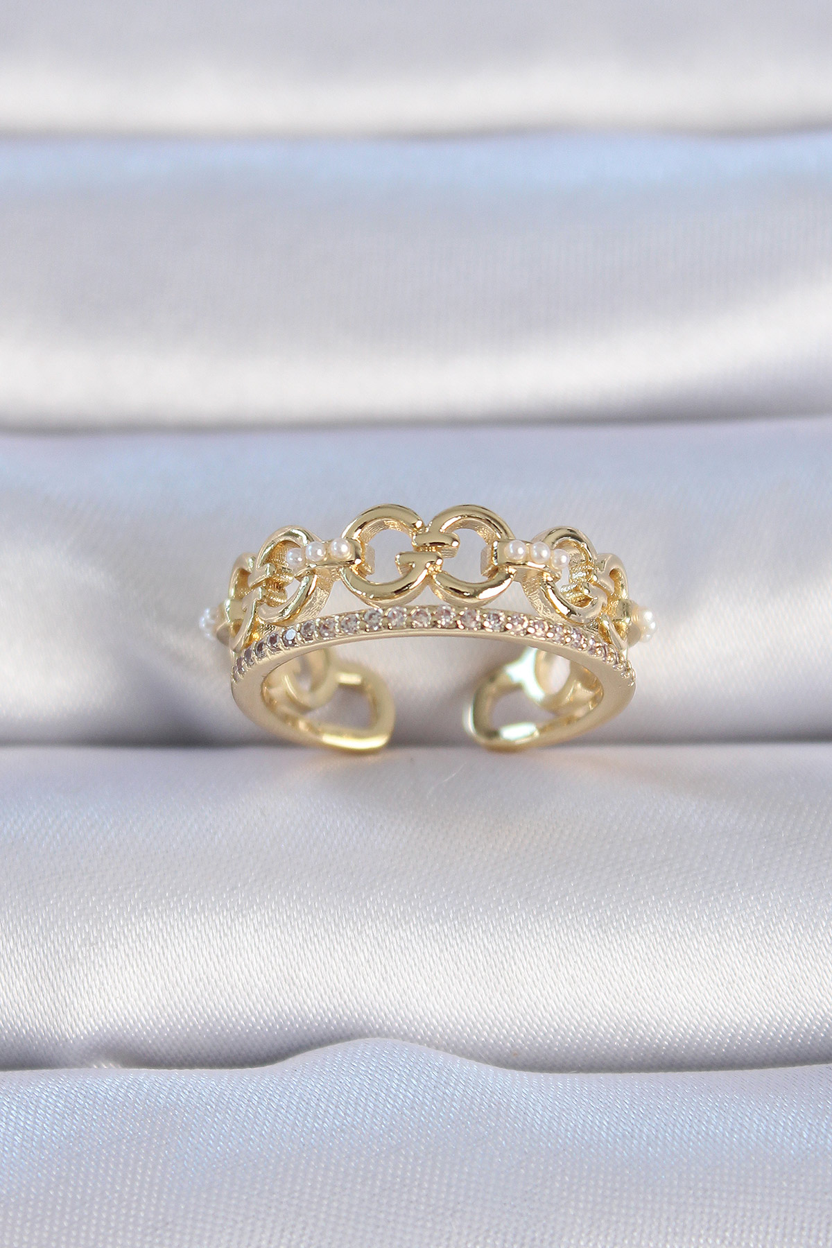 Pirinç Gold Renk Zirkon Taşlı İnci Detay Kadın Yüzük