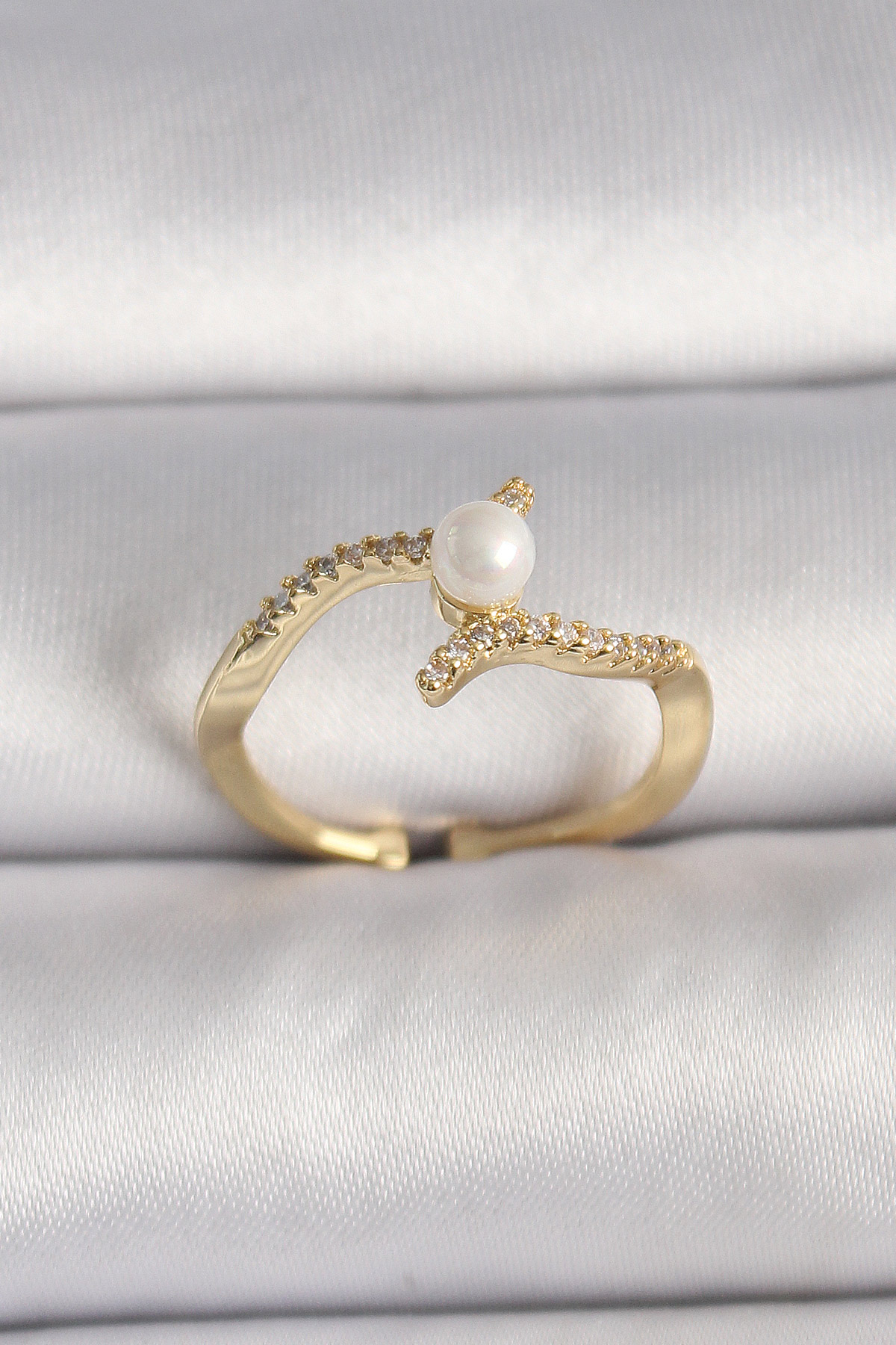 Pirinç Gold Renk Zirkon Taşlı İncili Ayarlanabilir Yüzük