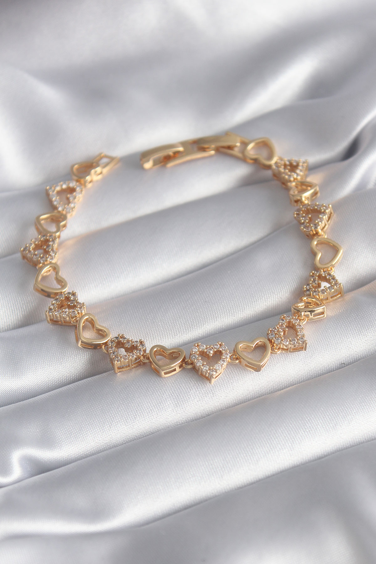 Pirinç Gold Renk Zirkon Taşlı Kalp Model VIP Seri Kadın Bileklik