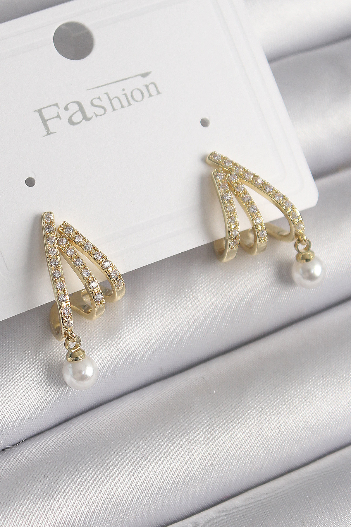 Pirinç Gold Renk Zirkon Taşlı Pençe Model İnci Detay Kadın Küpe