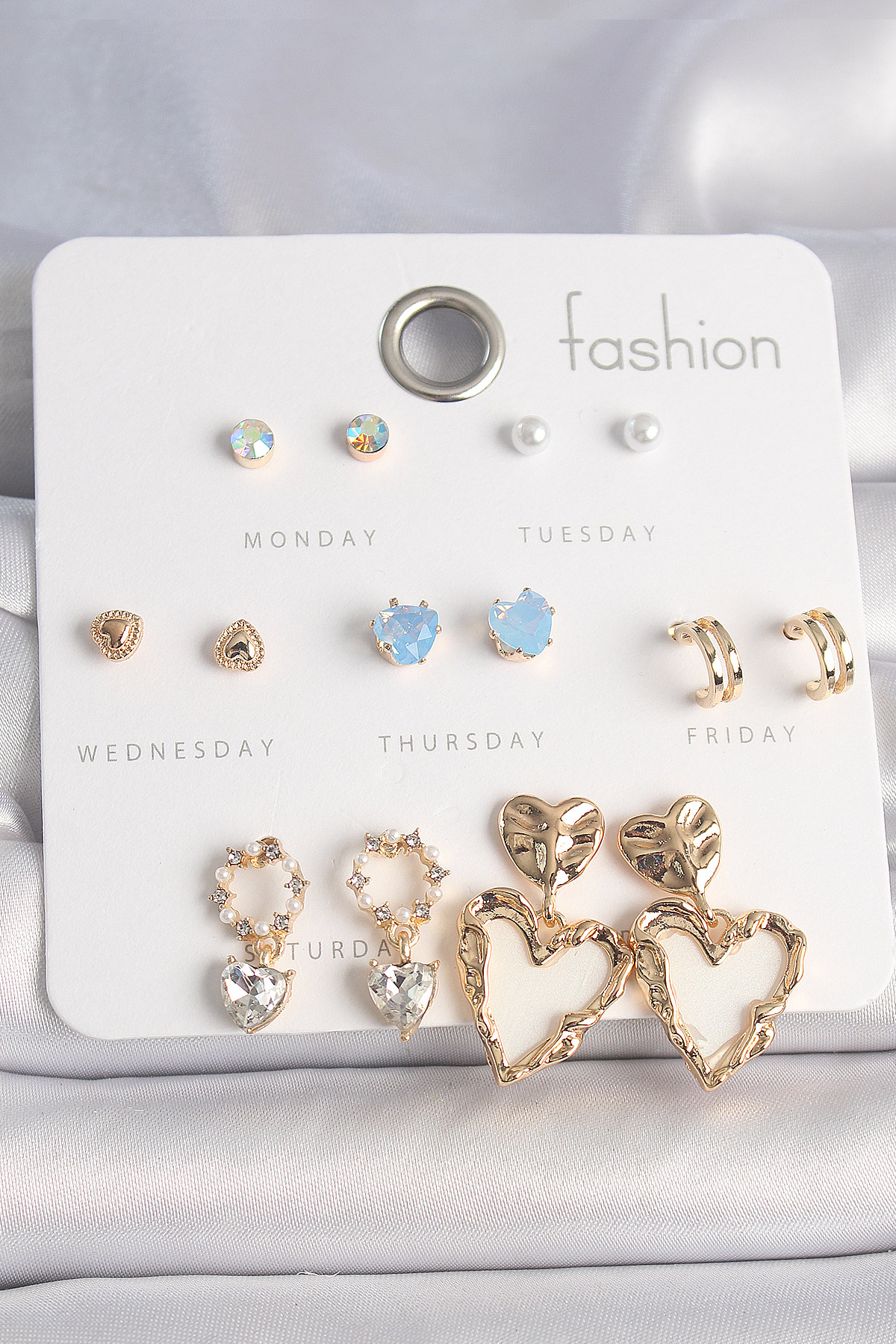 Pirinç Gold Renk Zirkon Taşlı Sallantı Beyaz Sedefli Kalp Model 7 Çift Kadın Küpe Seti