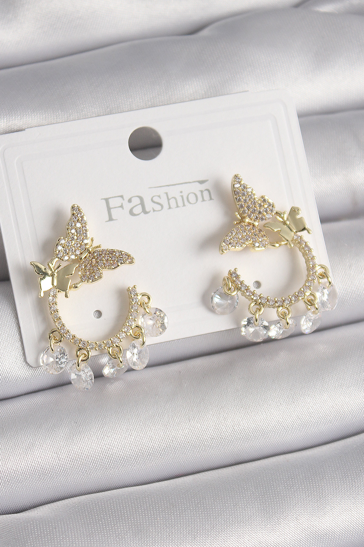 Pirinç Gold Renk Zirkon Taşlı Sallantı Detay Kelebek Model Kadın Küpe