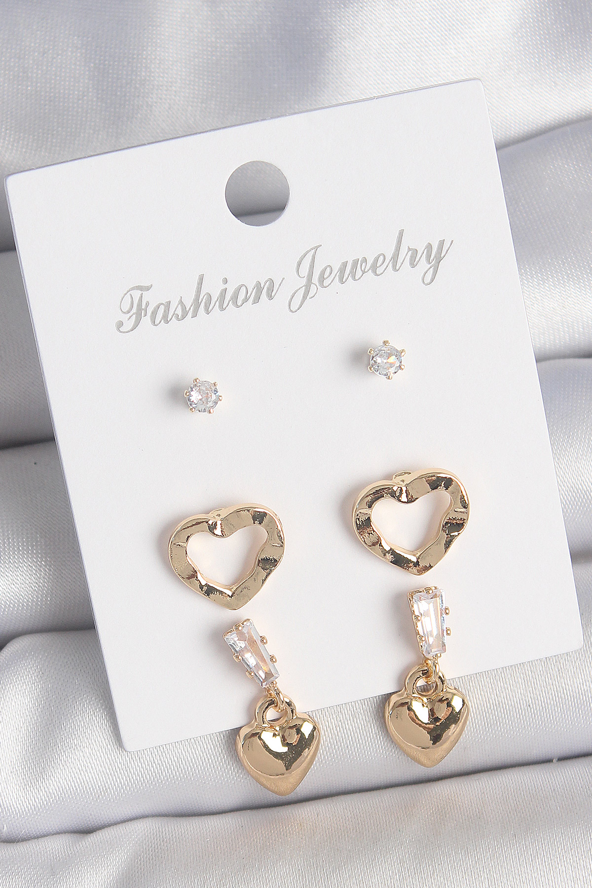 Pirinç Gold Renk Zirkon Taşlı Sallantı Kalp Model Kadın 3 Çift Küpe Seti
