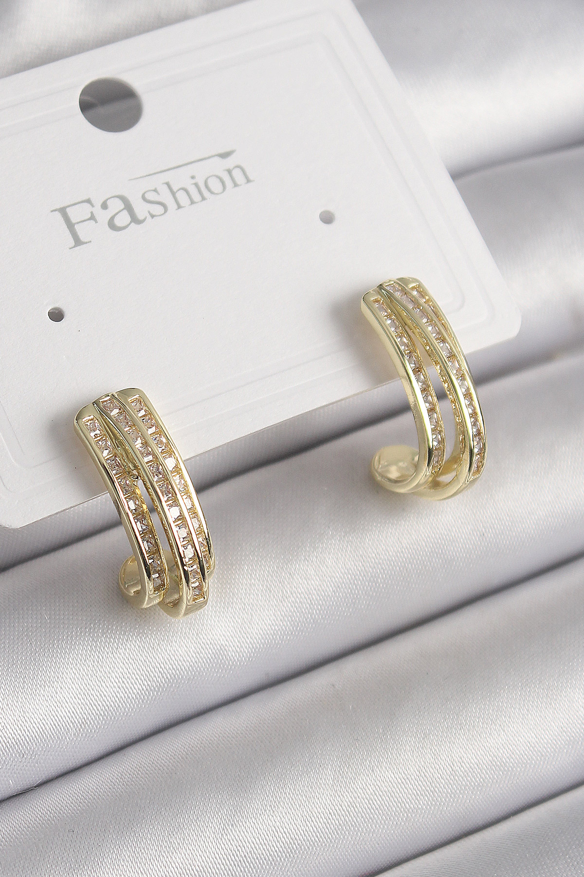 Pirinç Gold Renk Zirkon Taşlı Yarım Halka Model Kadın Küpe