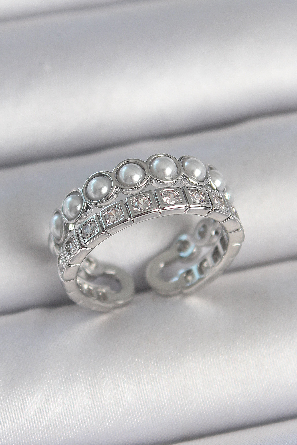 Pirinç Gümüş Renk 2’Li Sıra Zirkon Taşlı Ve İncili Ayarlanabilir Kadın Yüzük