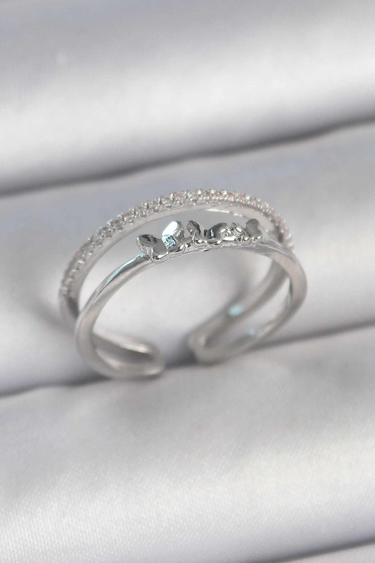 Pirinç Gümüş Renk 2’Li Zirkon Taş Detaylı Kelebek Figür Ayarlanabilir Model Kadın Yüzük