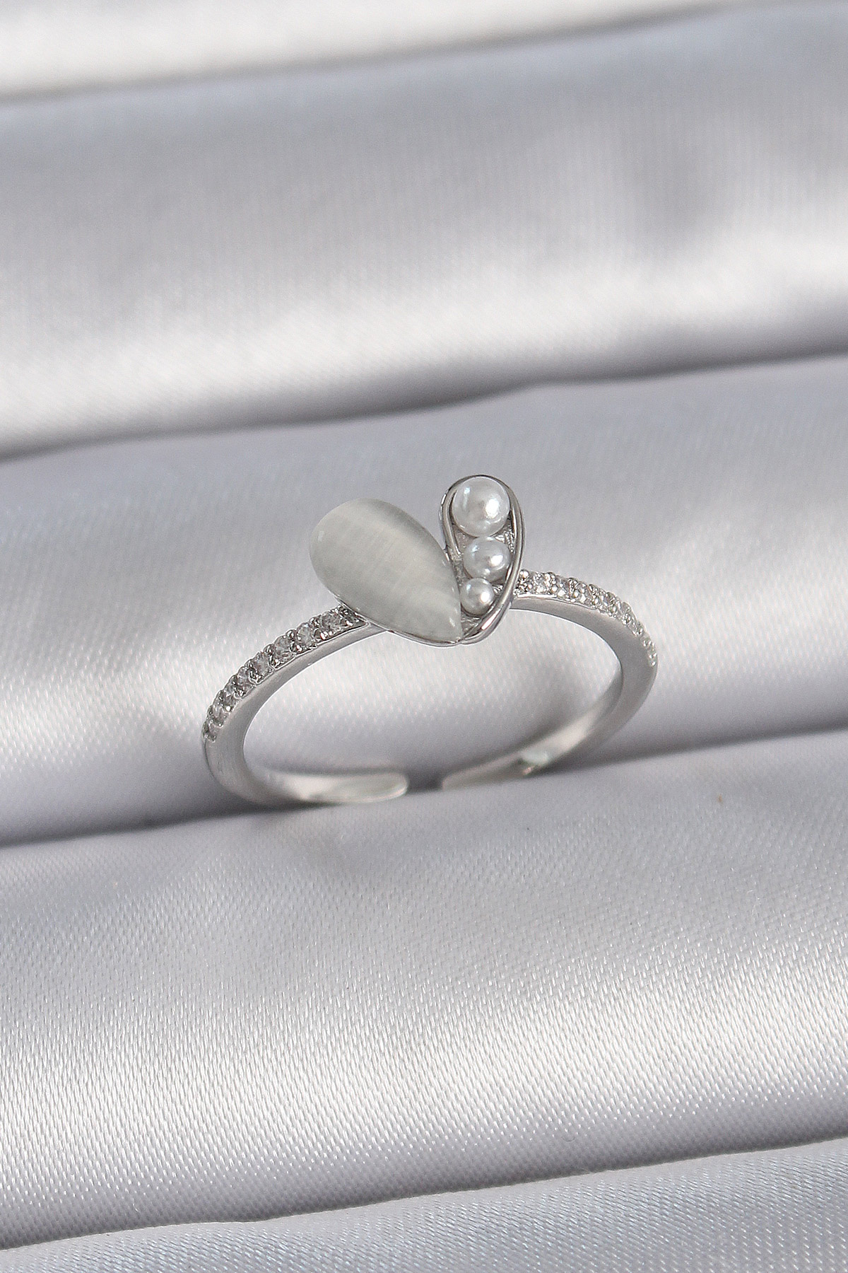Pirinç Gümüş Renk Ayarlanabilir Zirkon Taşlı İncili Beyaz Mineli Kalp Model Kadın Yüzük
