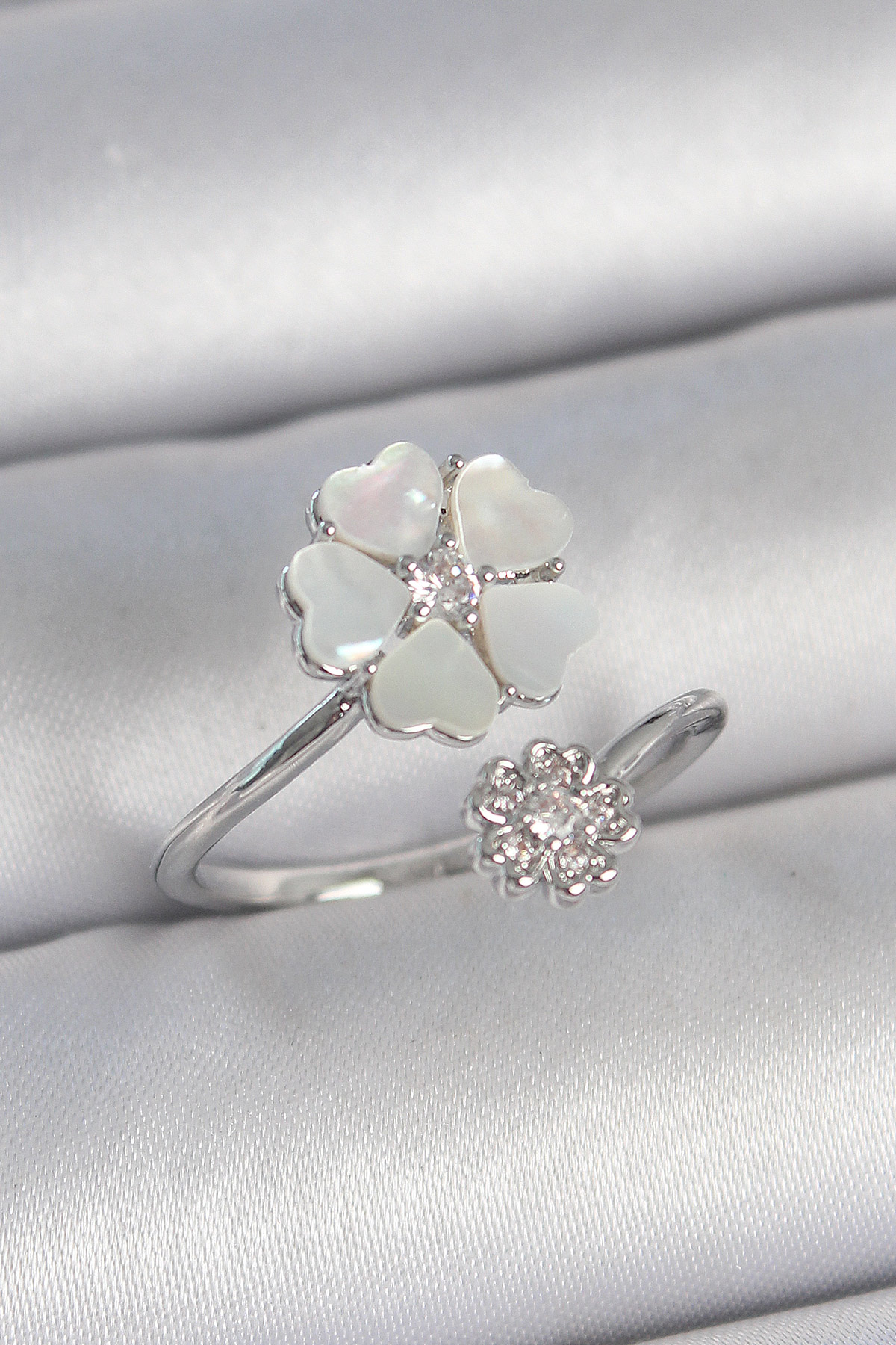 Pirinç Gümüş Renk Beyaz Mineli Çiçek Model Zirkon Taş Detay Kadın Yüzük