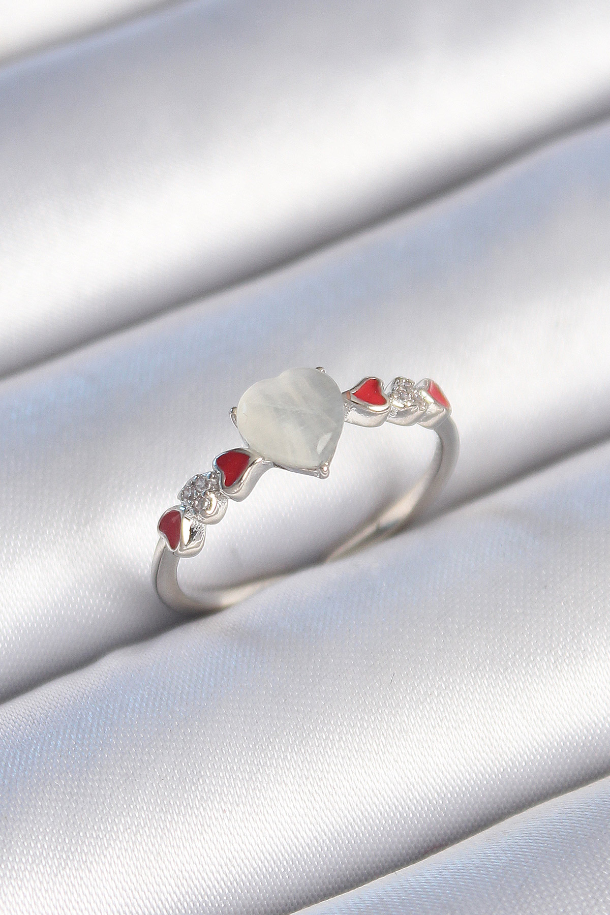 Pirinç Gümüş Renk Beyaz Mineli Kalp Model Zirkon Taş Detaylı Kadın Yüzük