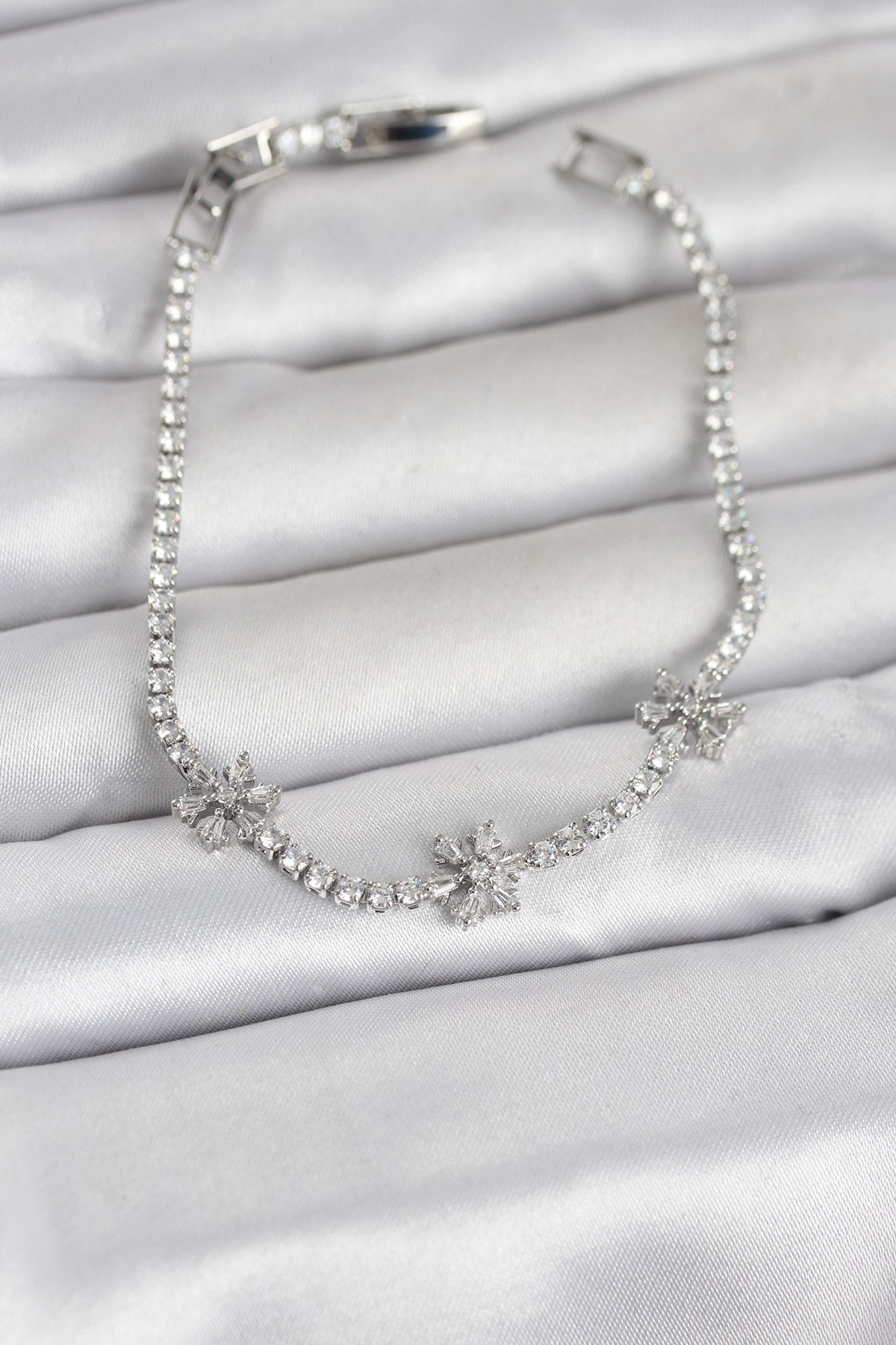Pirinç Gümüş Renk Çiçek Model Zirkon Taşlı Su Yolu Kadın Bileklik