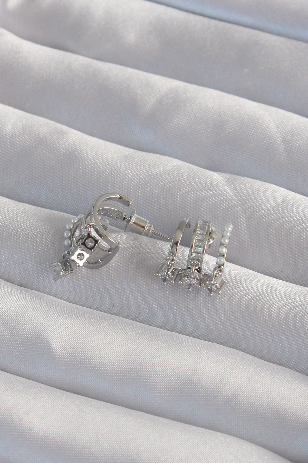 Pirinç Gümüş Renk İncili Çoklu Zirkon Taşlı Yarım Halka Küpe