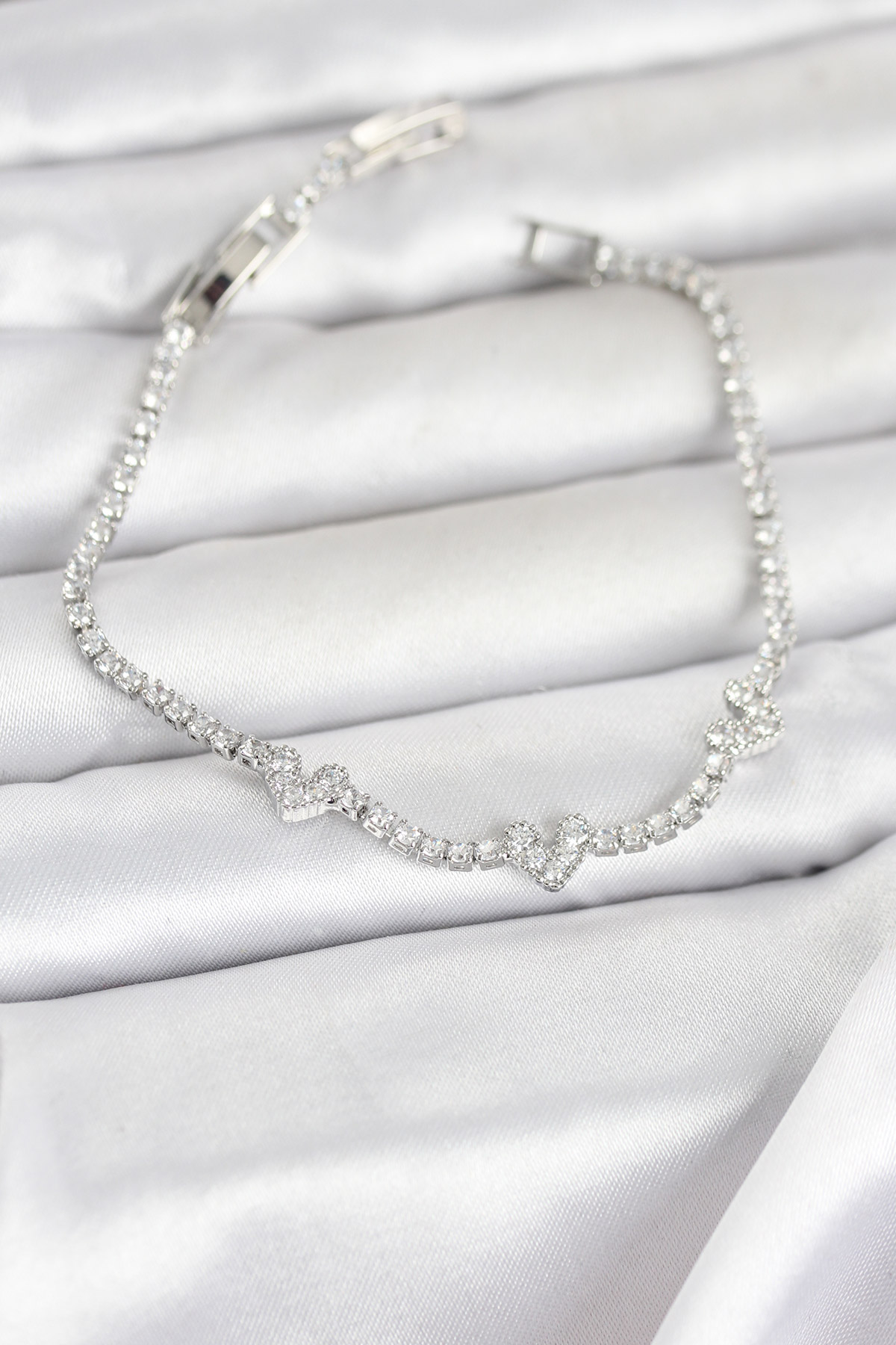 Pirinç Gümüş Renk Kalp Model Zirkon Taşlı Su Yolu Kadın Bileklik
