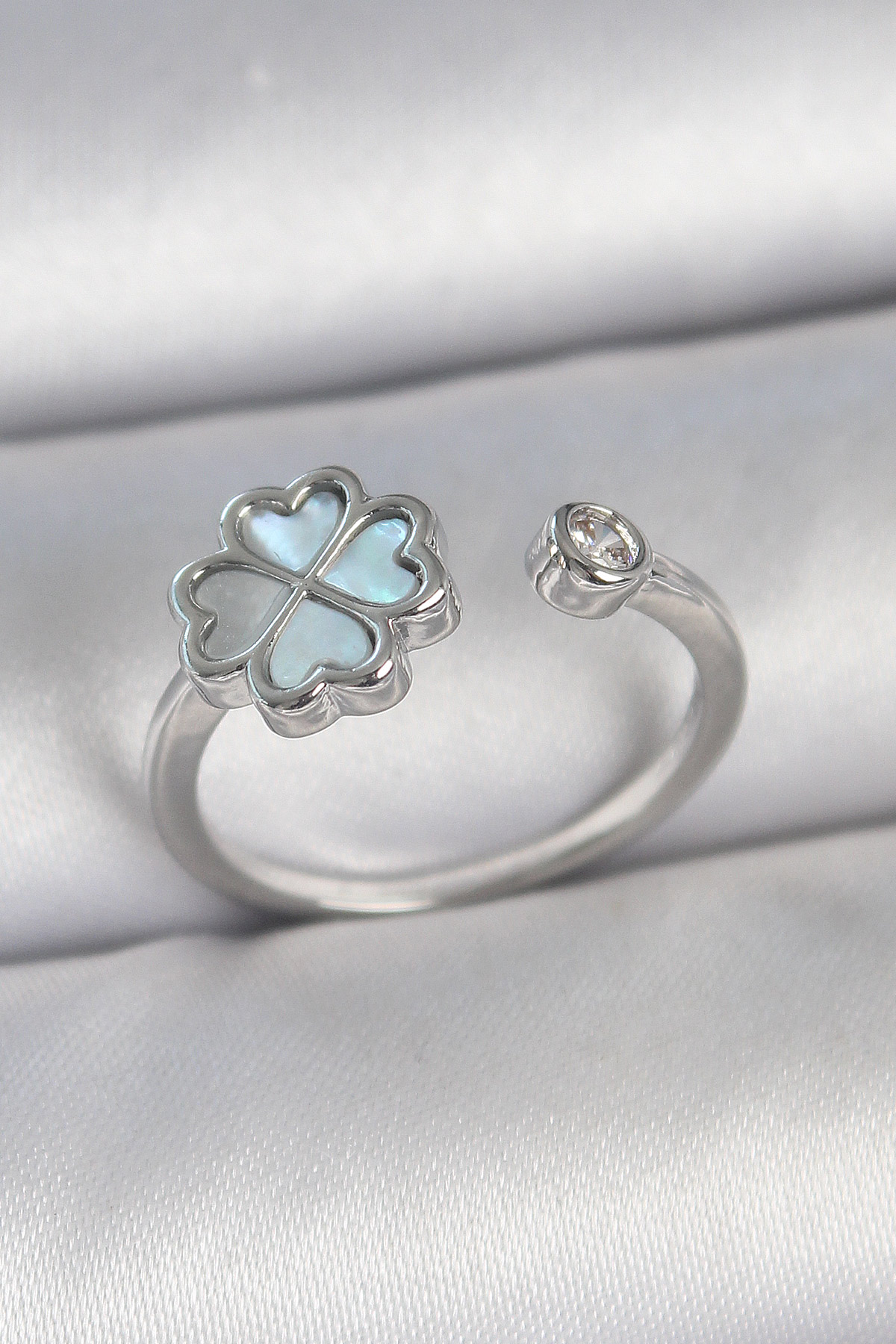 Pirinç Gümüş Renk Mavi Mineli Yonca Model Zirkon Taş Detay Ayarlanabilir Kadın Yüzük