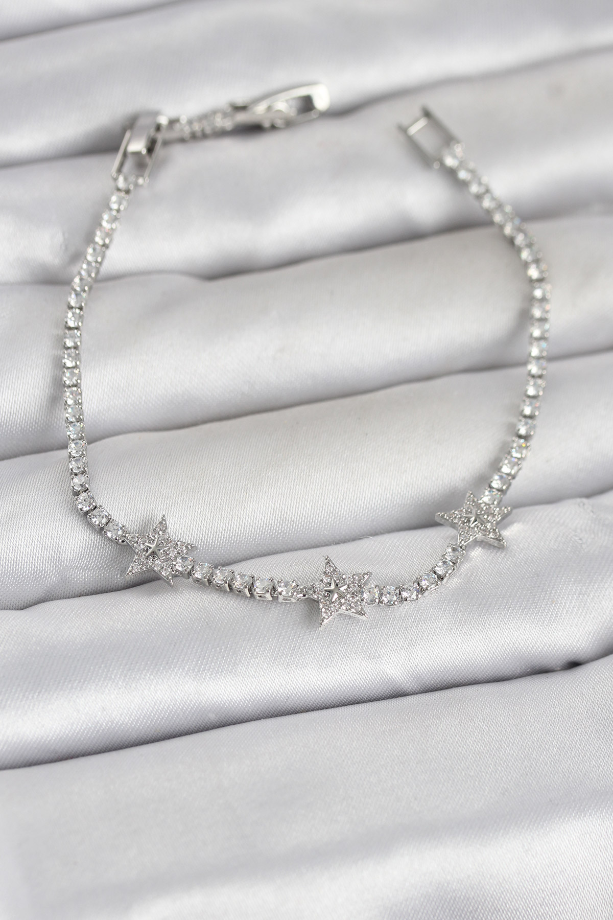 Pirinç Gümüş Renk Minimal Yıldız Model Zirkon Taşlı Su Yolu Kadın Bileklik