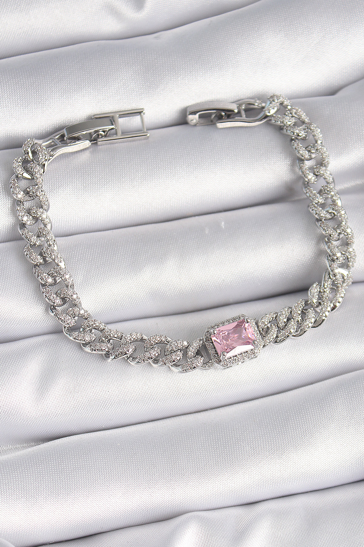 Pirinç Gümüş Renk Pembe Kare Zirkon Taşlı VIP Seri Kadın Bileklik