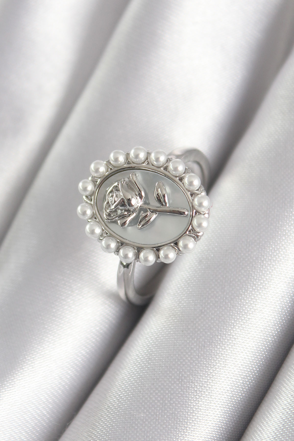 Pirinç Gümüş Renk Portre Gül Model İnci Detay Kadın Yüzük