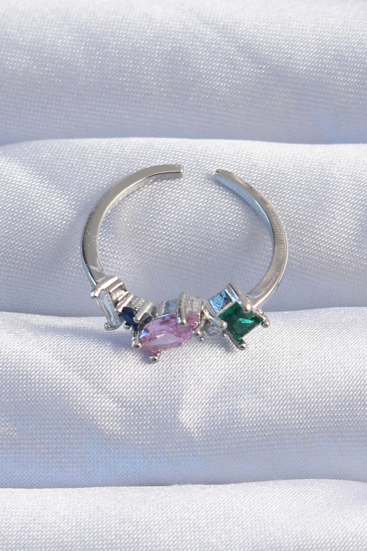 Pirinç Gümüş Renk Renkli Zirkon Taşlı Ayarlanabilir Yüzük