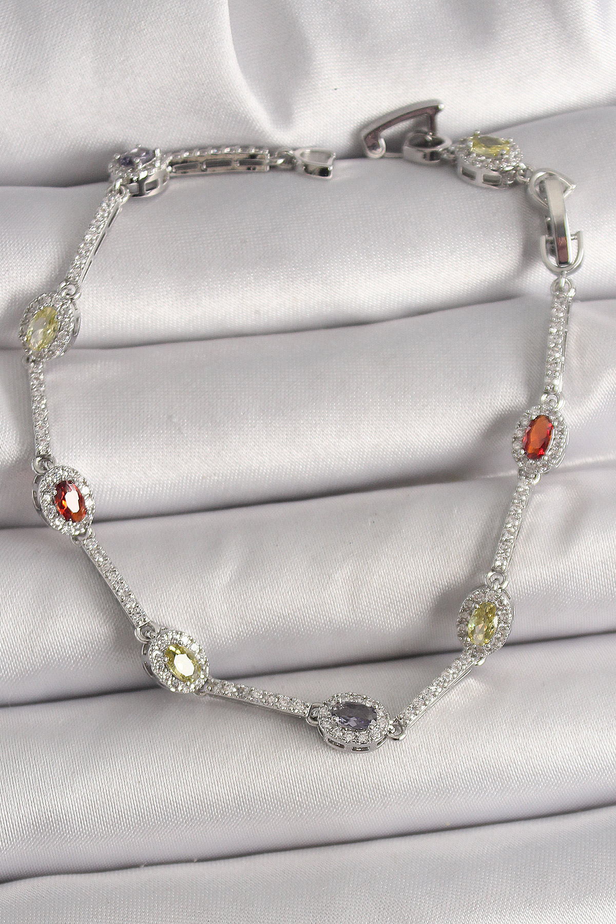 Pirinç Gümüş Renk Renkli Zirkon Taşlı Damla Taş Model Kadın Bileklik
