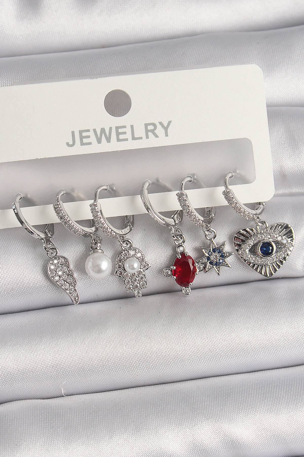 Pirinç Gümüş Renk Sallantı Zirkon Taşlı Fatma Ana El Figür Kadın Küpe Seti