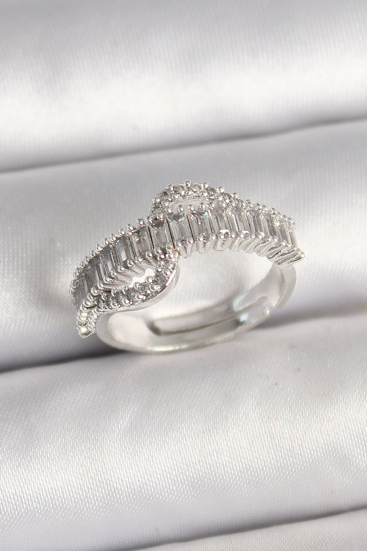 Pirinç Gümüş Renk Su Yolu Zirkon Taşlı Ayarlanabilir Model Kadın Yüzük