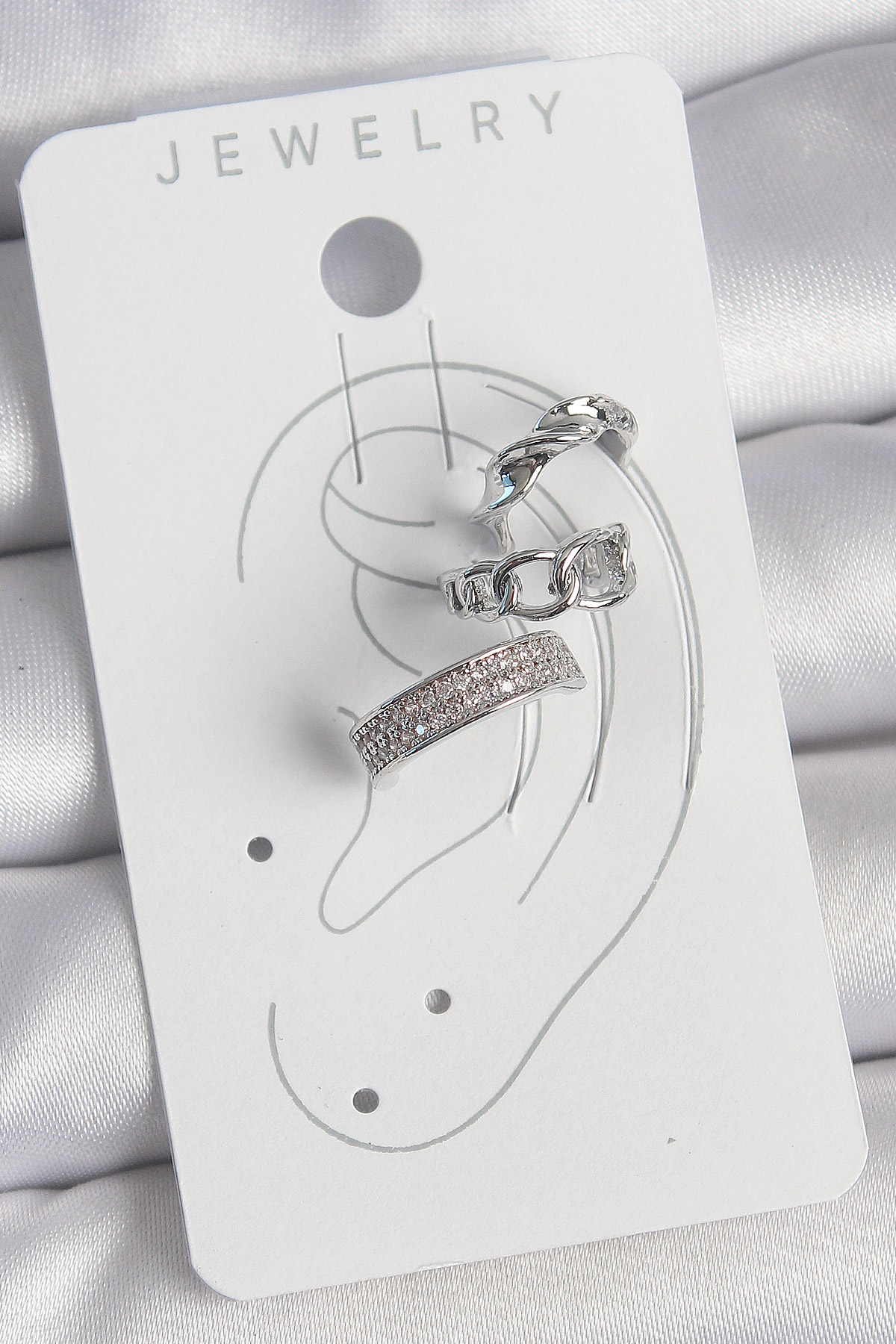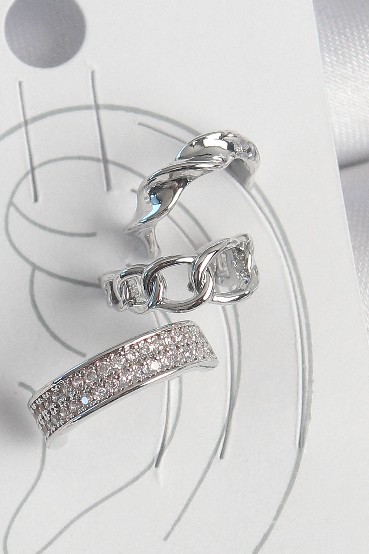 Pirinç Gümüş Renk Zirkon Taşlı 3’Lü Zincir Sarmal Model Kadın Kıkırdak Küpe