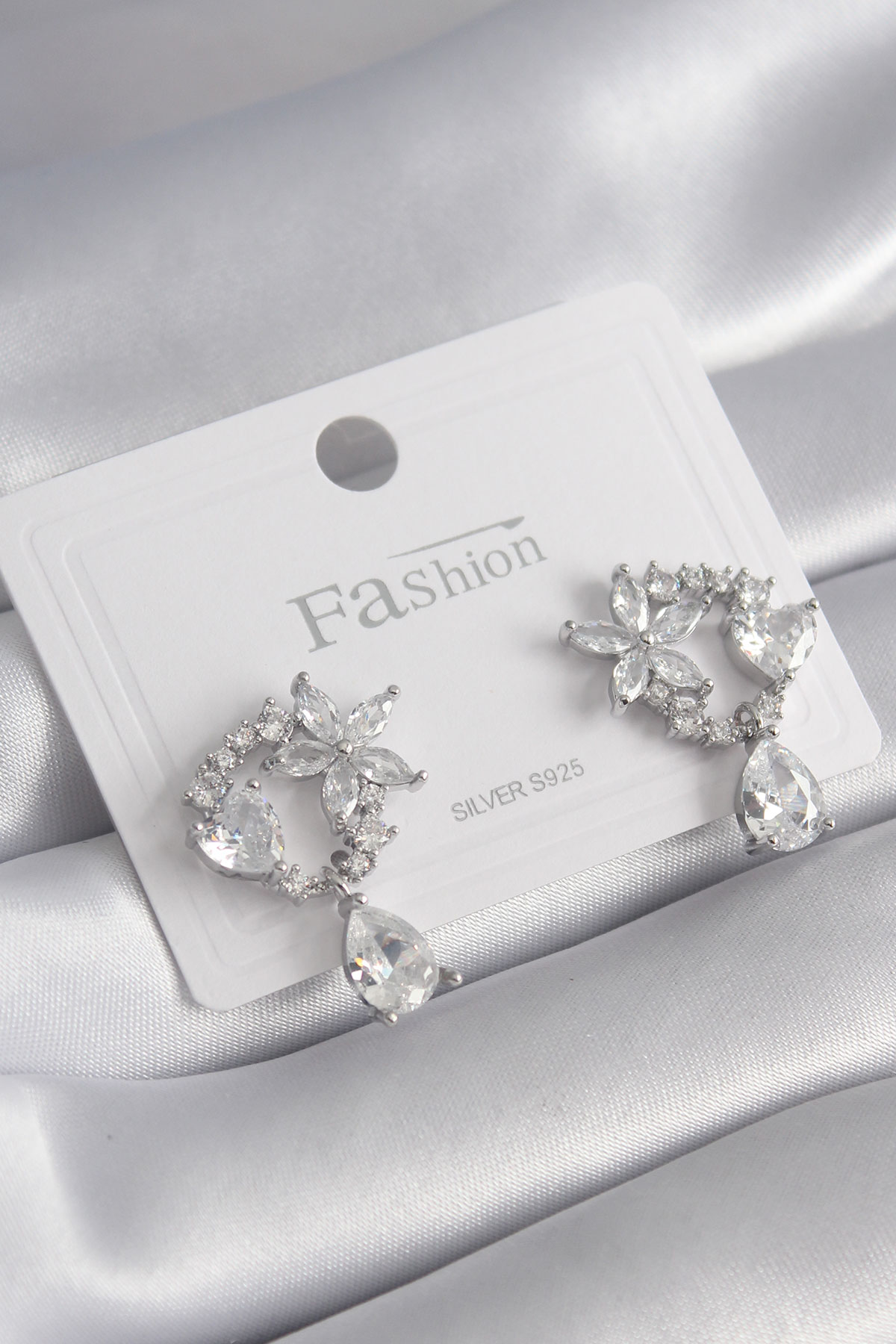 Pirinç Gümüş Renk Zirkon Taşlı Çiçek Model Sallantı Detay Kadın Küpe