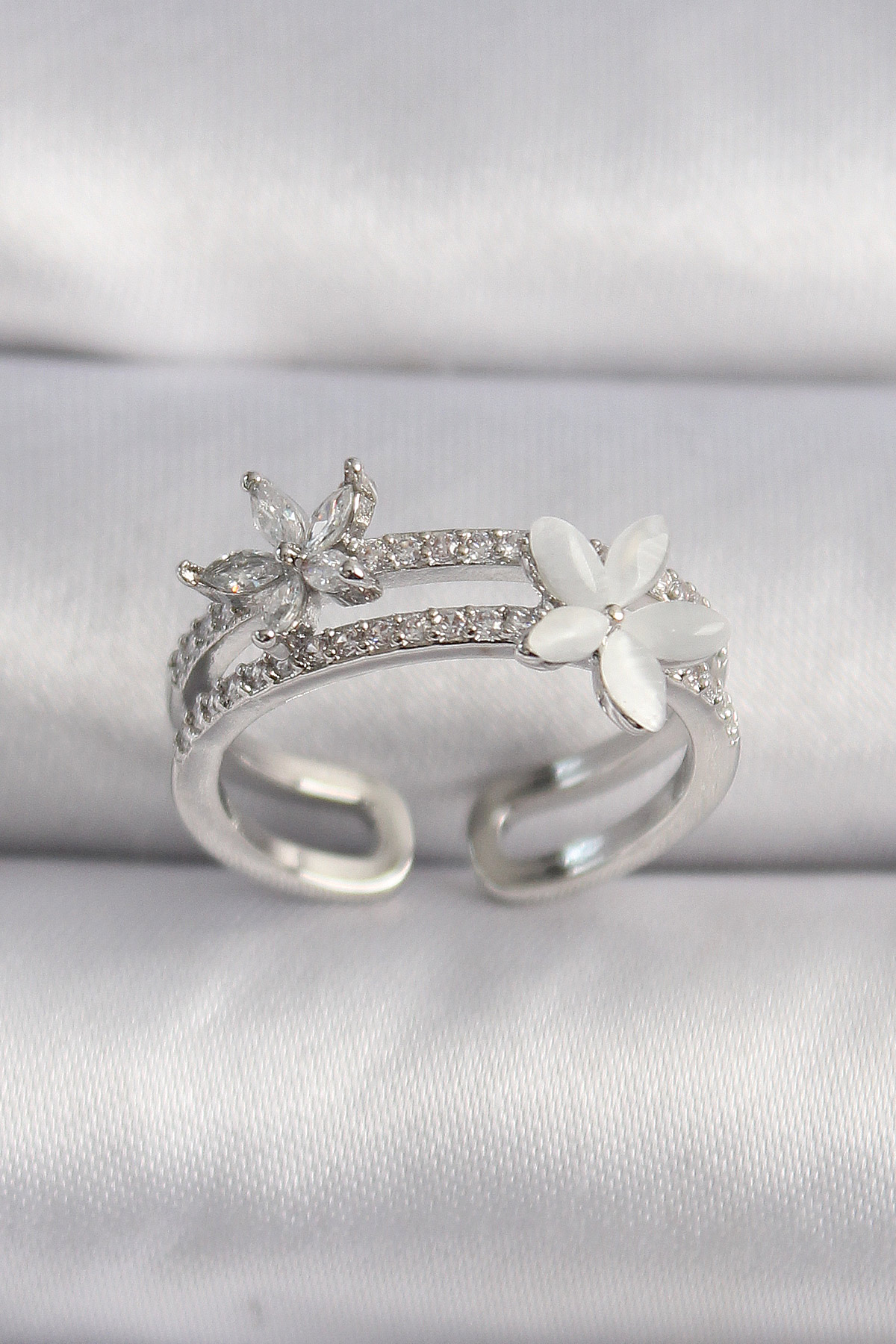 Pirinç Gümüş Renk Zirkon Taşlı Çiçek Model VIP Seri Kadın Yüzük