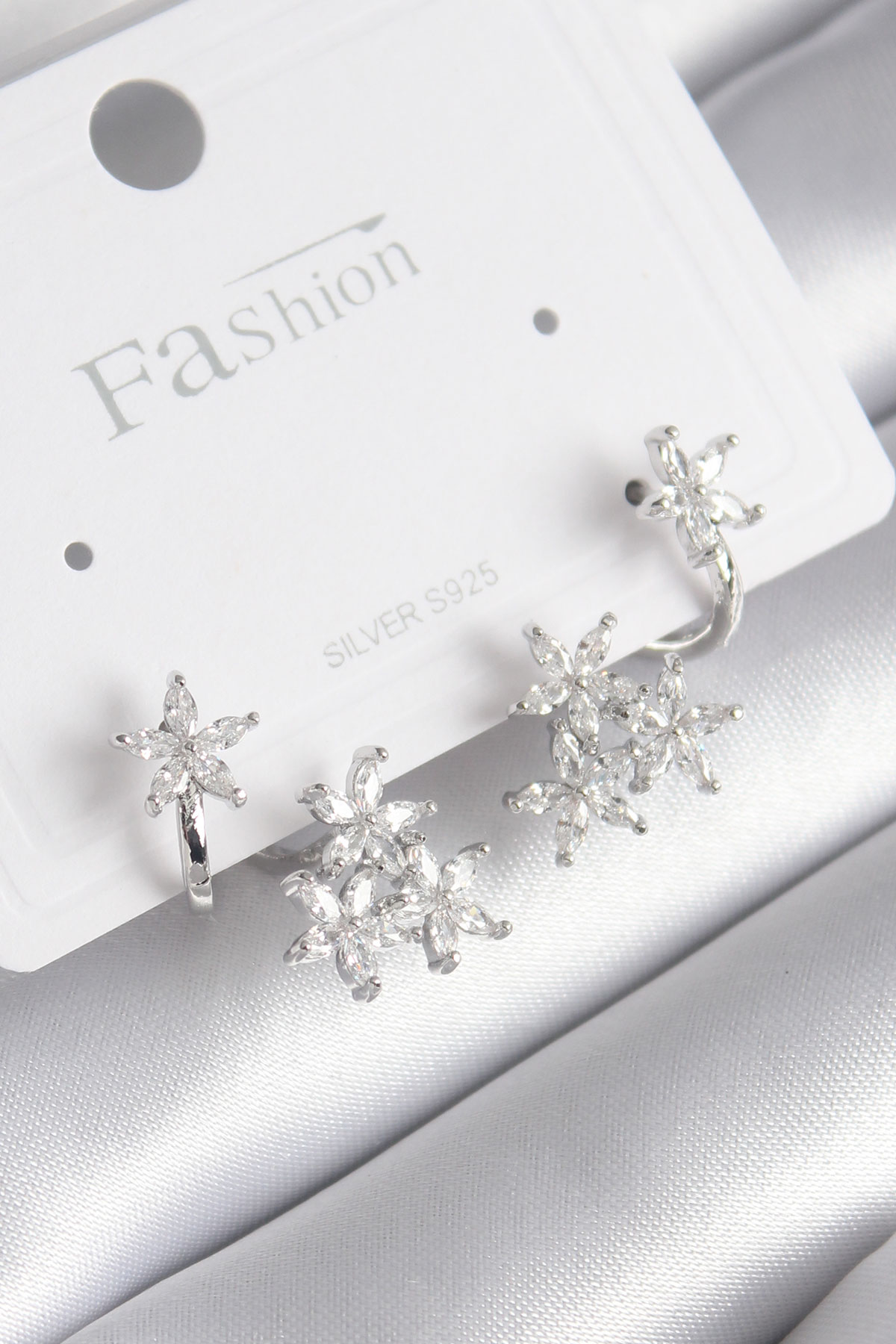 Pirinç Gümüş Renk Zirkon Taşlı Çiçek Tasarım Kadın Küpe
