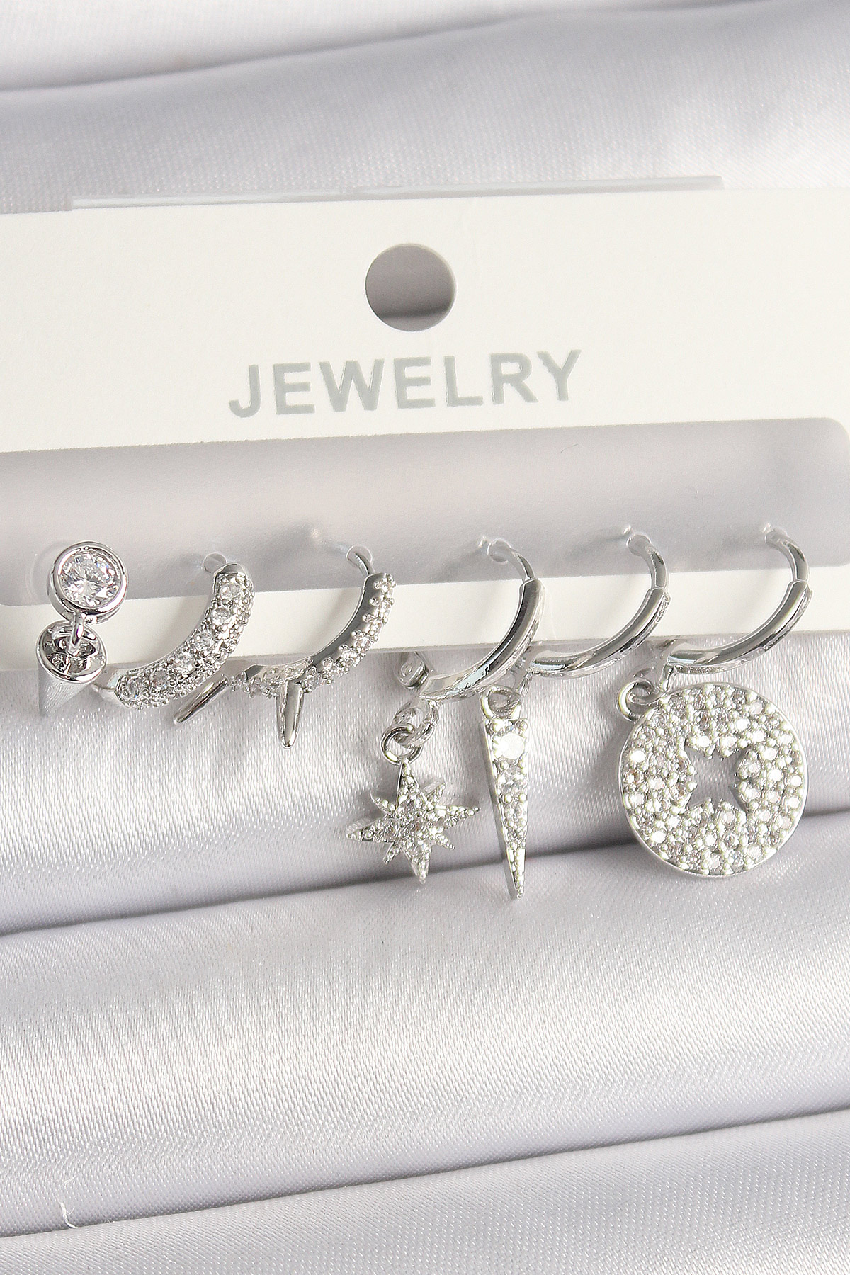 Pirinç Gümüş Renk Zirkon Taşlı Çoklu Figür Kadın Küpe Seti