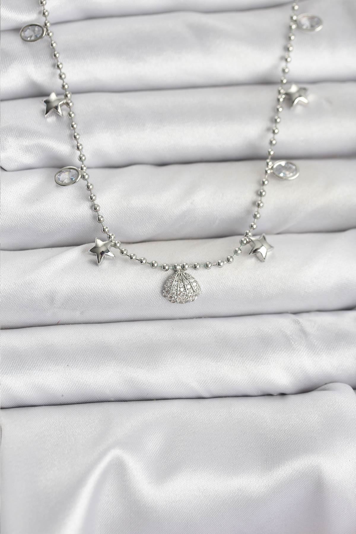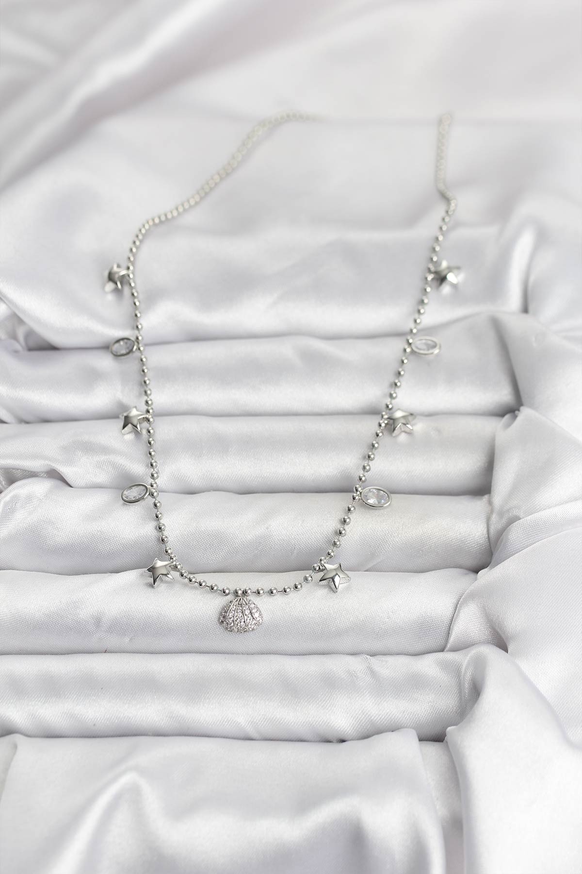 Pirinç Gümüş Renk Zirkon Taşlı Deniz Kabuğu Model Kadın Kolye